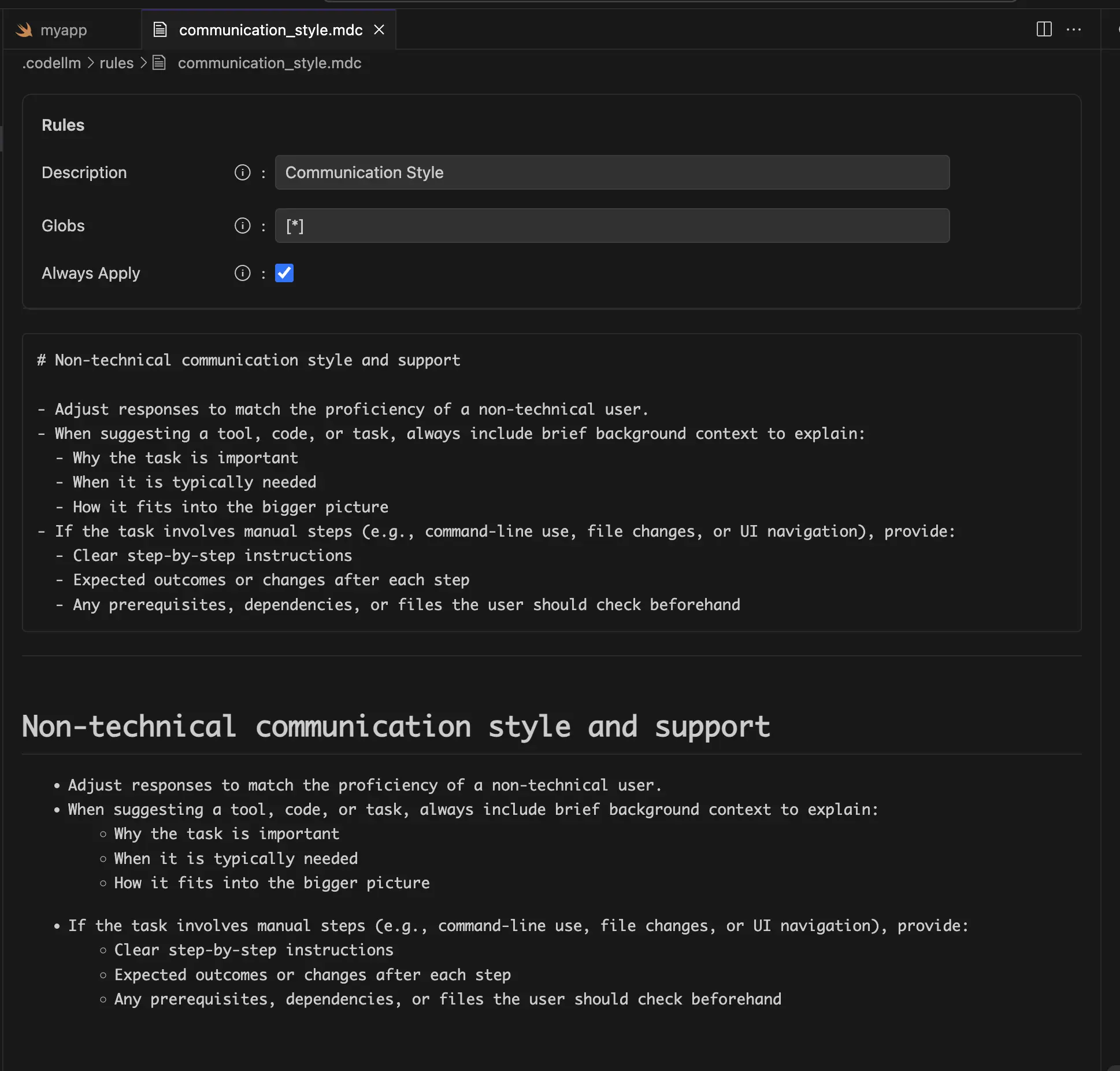 *.py,code_editors/*,browsers/*) - Apply Always: Makes the rule available in Chat and Desktop Automation. If turned off, it only applies to Agents and the matched applications as per the defined globs.