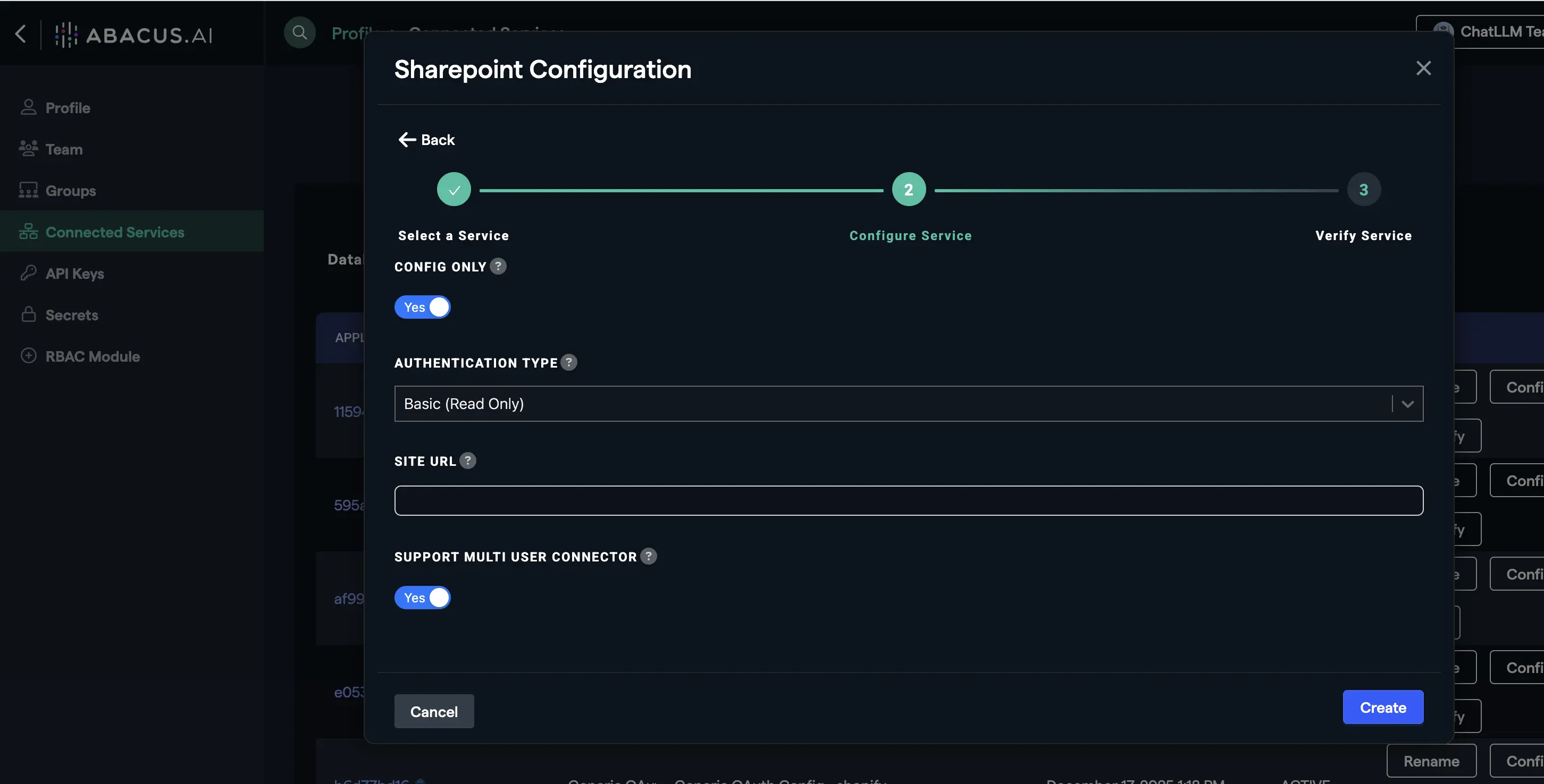 - Select "Basic" if you want to use Abacus.AI app for read only Sharepoint user connector.