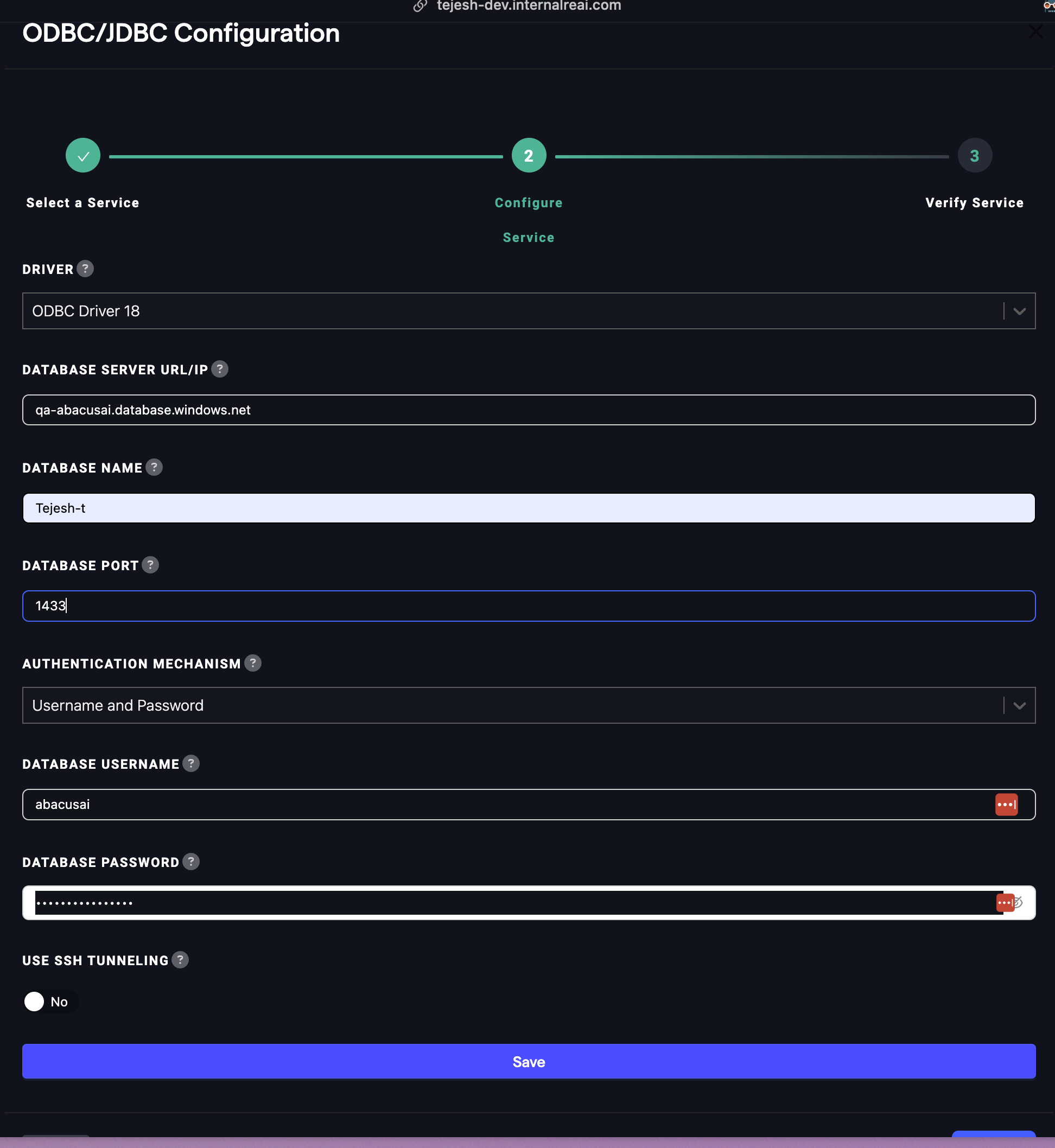 3. Ensure that all other required information, such as the database server URL/IP, port, and authentication details, are correctly provided and that the Abacus.AI IP address is whitelisted.