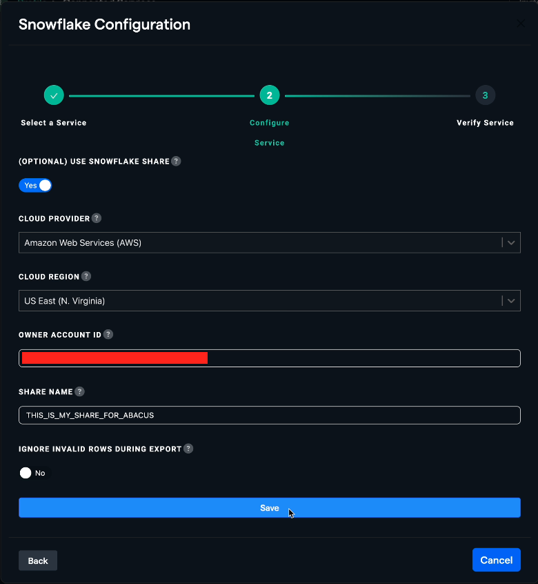 - Paste the Account ID from step 5 into the box under "Share With Snowflake Accounts."