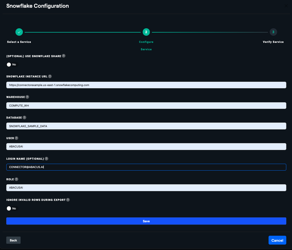 - USER: Pick any string for a unique user name to be created specifically for Abacus.AI. "ABACUSAI" is commonly used, but is not required to be the user name. This user will be used to connect to Snowflake.