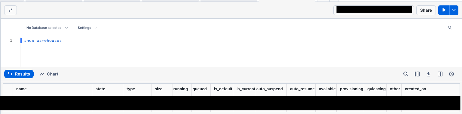 SHOW WAREHOUSESin a Snowflake SQL worksheet. The warehouse is the compute resource in Snowflake.