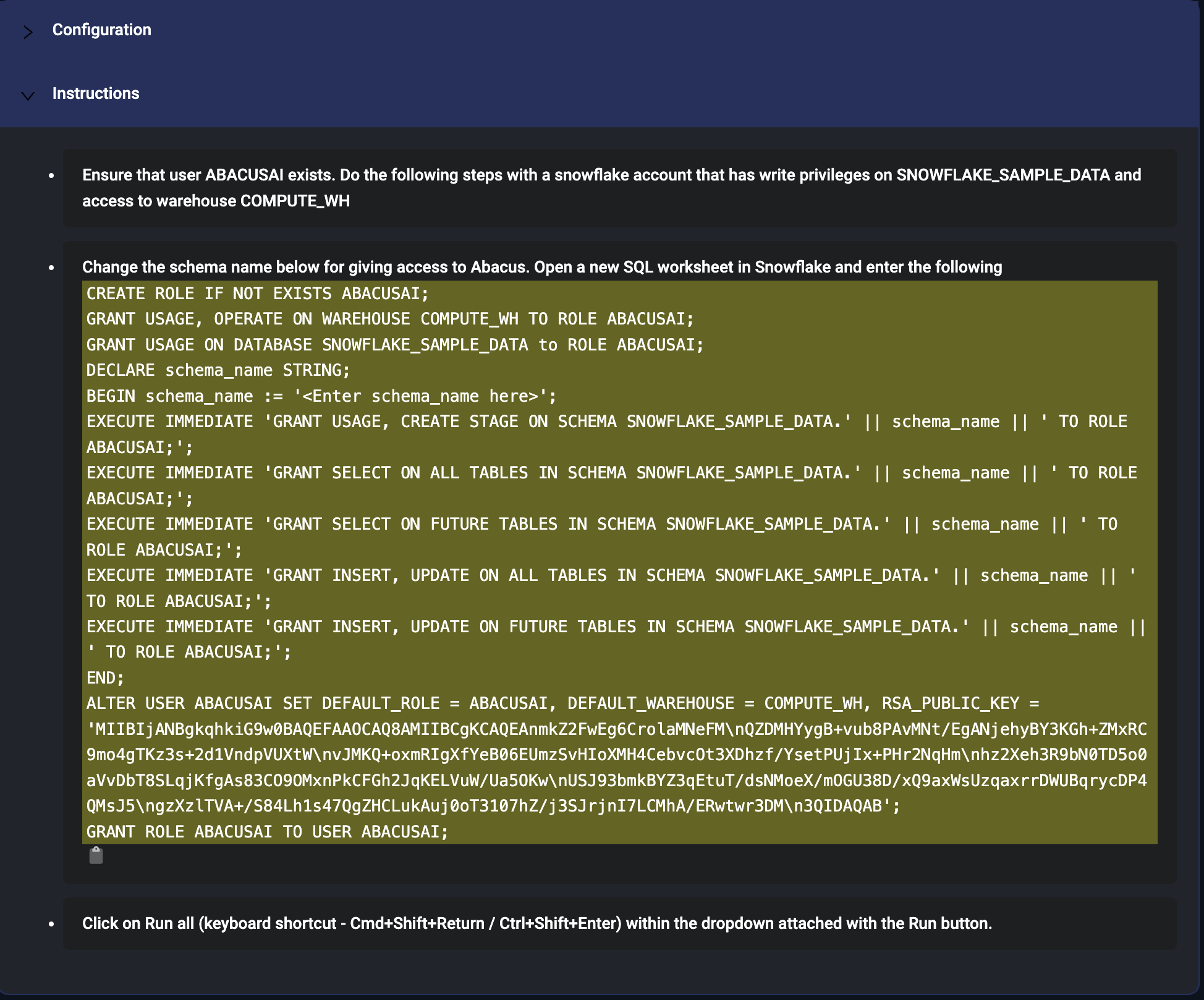 You will get a pop-up with instructions to run a command in Snowflake. This command will create the necessary user and role for Abacus.AI.