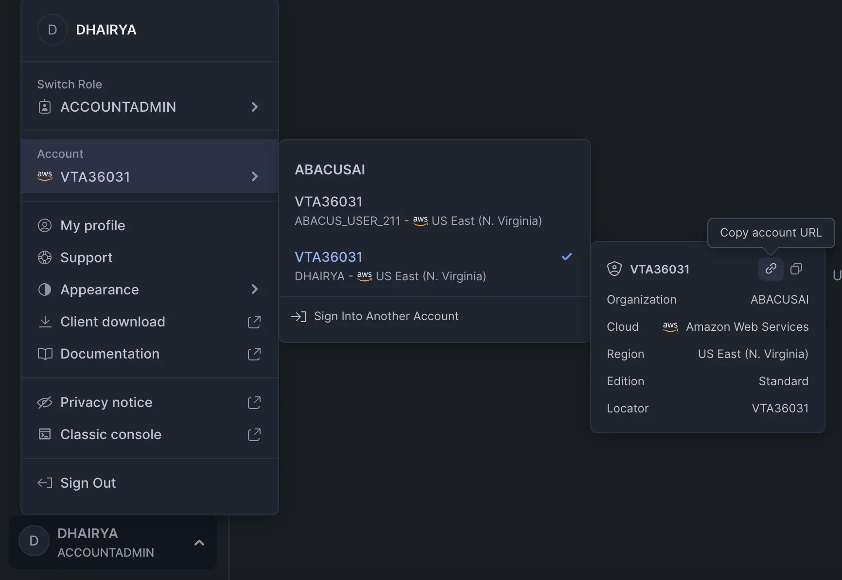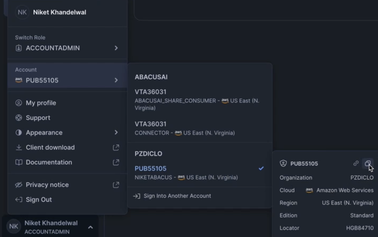 Owner Account ID: Click on your account ID, the eight-digit alphanumeric code located at the bottom-left corner of your Snowflake homepage. Then, hover over the resulting pop-up menu to reveal the "copy account identifier" button, resembling two squares.