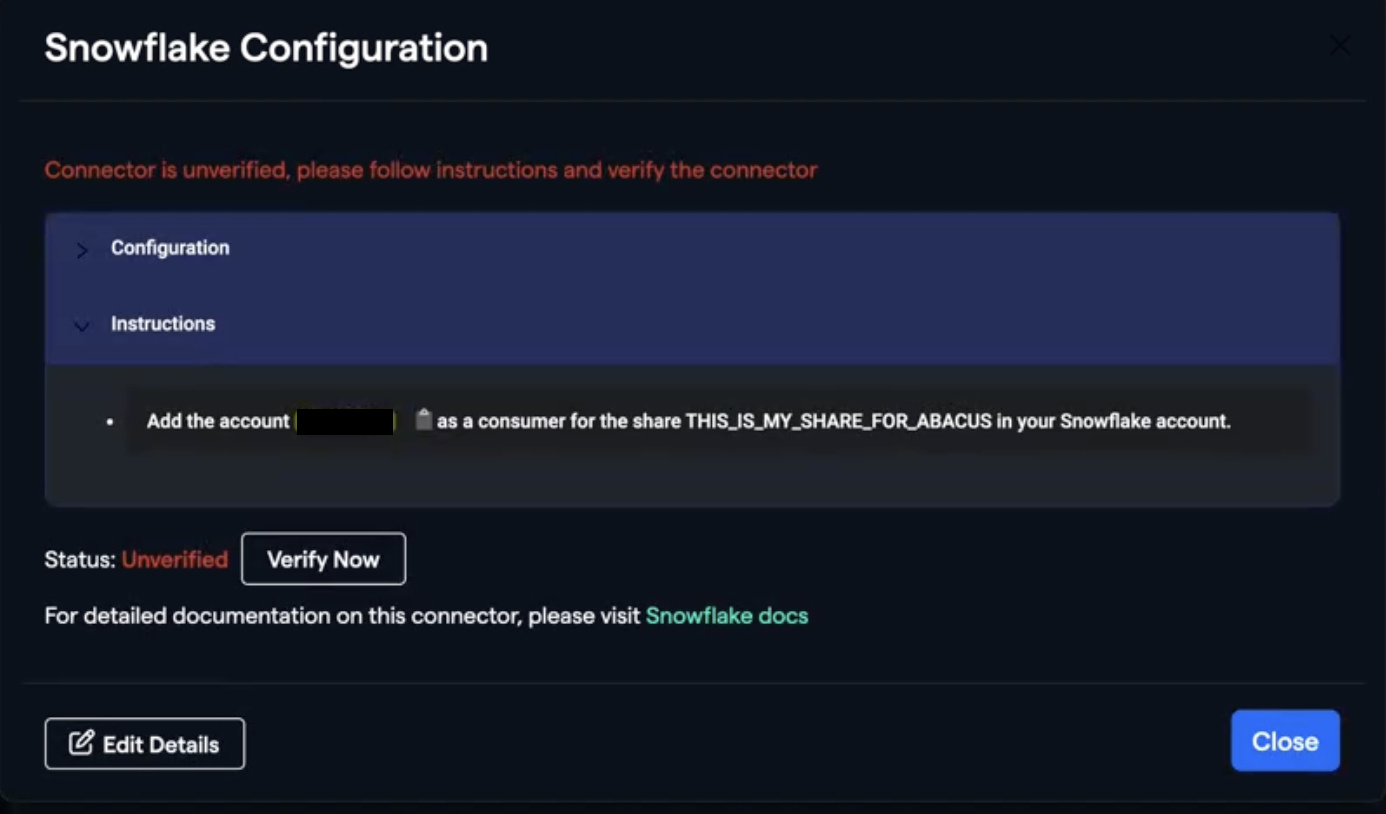 - Finally, back in Abacus.AI, hit the "Verify Now" button below the instructions in the Snowflake Configuration. After this point, you will have successfully set up a Snowflake Share connector.