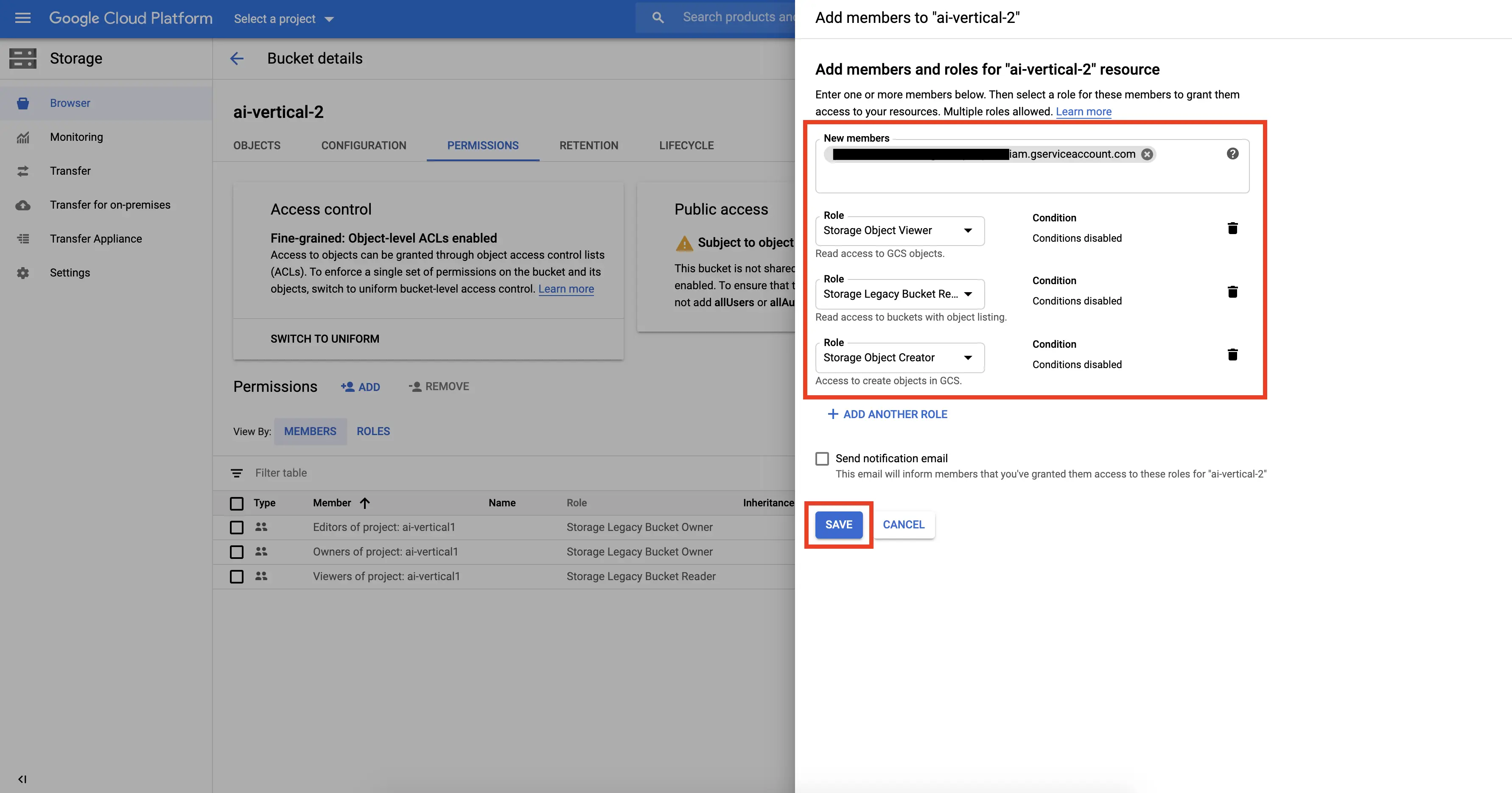 Click on the "Select a role" drop-down menu and choose the "Storage Object Viewer" option. Next, click on the "ADD ANOTHER ROLE" button and select "Storage Legacy Bucket Reader" role. Repeat this process to add "Storage Object Creator" role if you want to give Abacus.AI the ability to write batch prediction results to this bucket, and finally click on "Save" button.