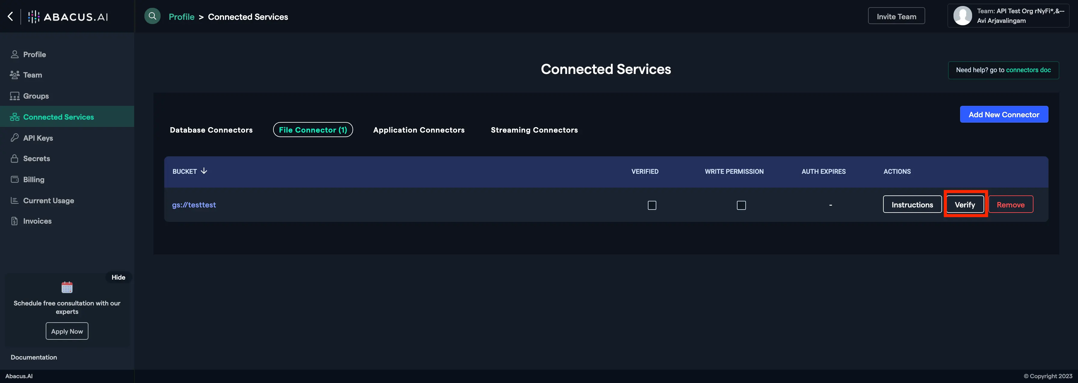 Go back to the Abacus.AI Connected Services Dashboard, find your Google Cloud bucket in the list, and check if there's a "Verify" button for it. If there isn't a "Verify" button but the bucket is listed with the option to remove it then that means your bucket was successfully verified by the system. Otherwise, click on the "Verify" button for your bucket listing to verify the bucket manually.