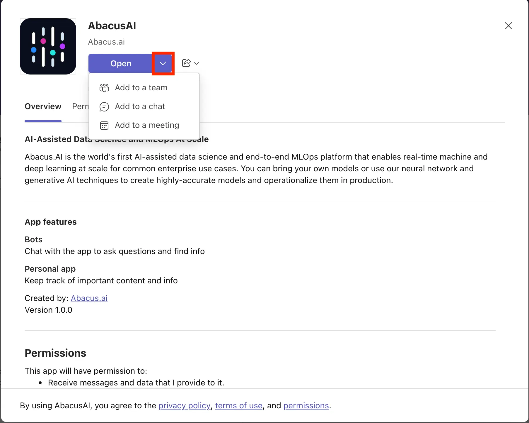 Use the search bar to find the Abacus.AI app, or click here to view the app in the Microsoft Teams Store.