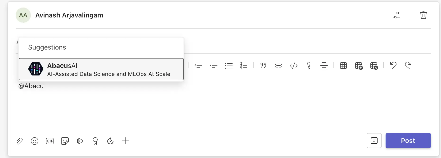The Abacus.AI Microsoft Teams App allows you to interact with your AI models directly within Microsoft Teams. Follow the instructions below to set up and use the Teams connector.