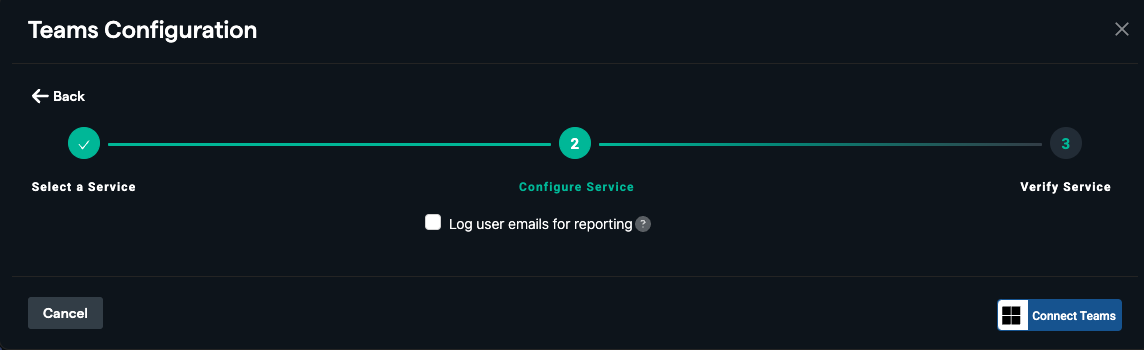 - Ensure the "Log user emails for reporting" toggle is enabled in the Microsoft Teams Connector settings.