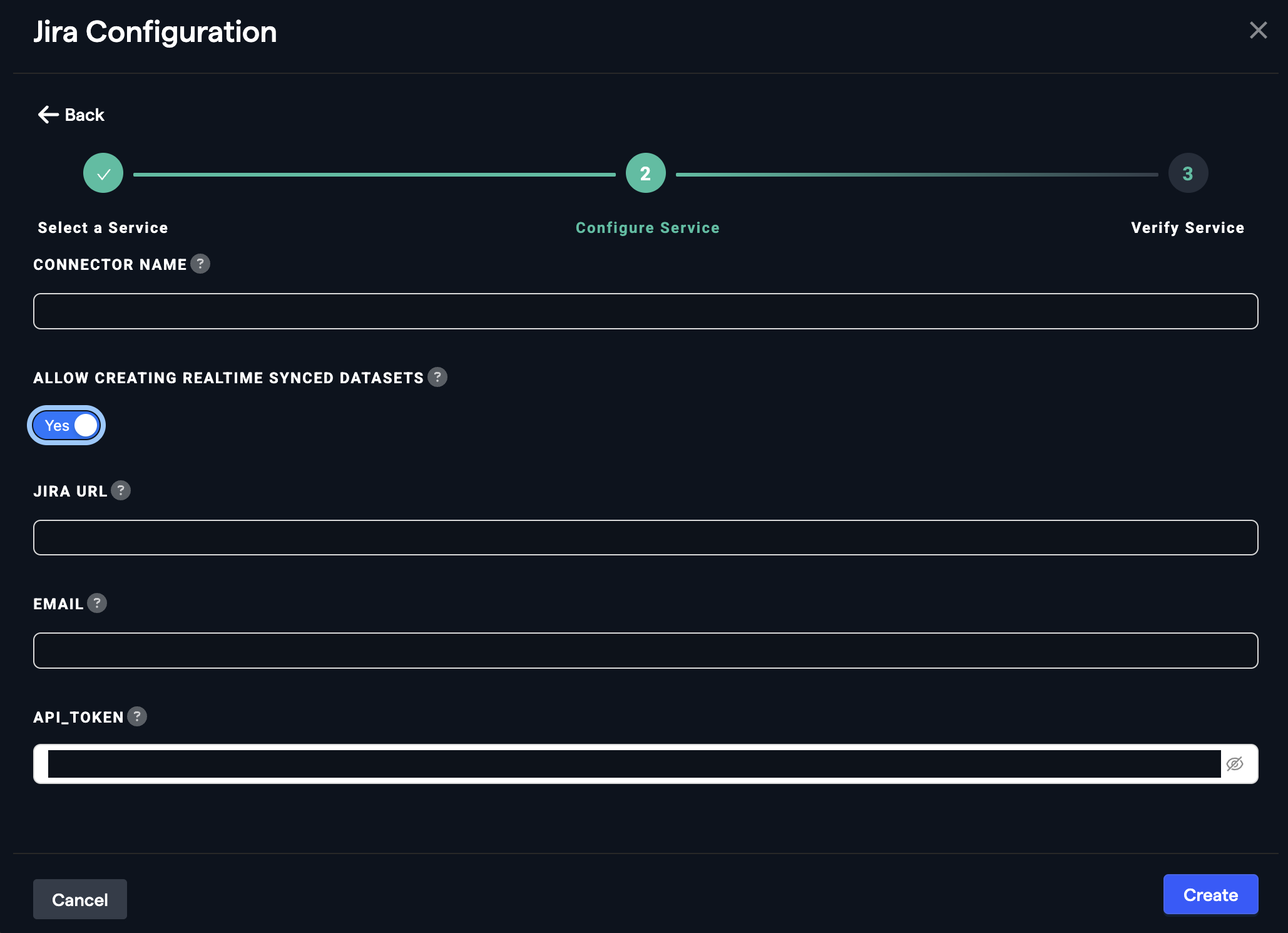 - Realtime Synced Datasets: Toggle on the option to "Allow creating realtime synced datasets" during setup. This validates that the authentication credentials are sufficient to fetch privileged data from the Jira backend. Without this, the connector and dataset may not work as expected.