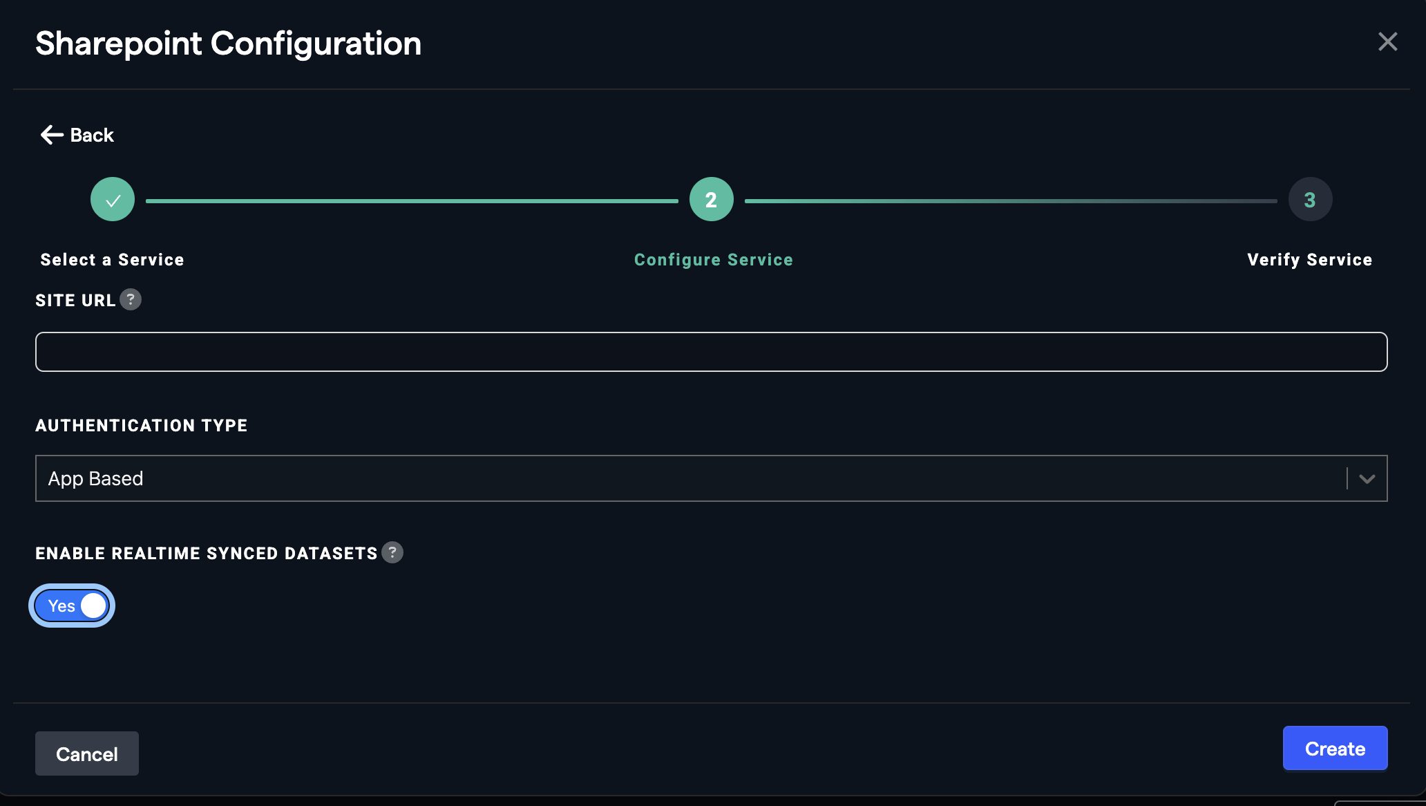 - Enter your SharePoint site URL, toggle on Enable Realtime Synced Dataset, and click Create.
