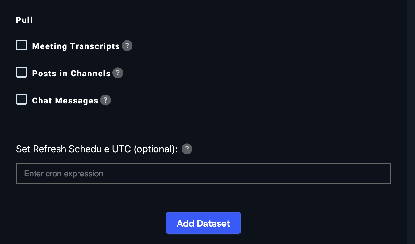 - Use one of the connected data sources (e.g., Teams, Confluence, Jira) to create a dataset.