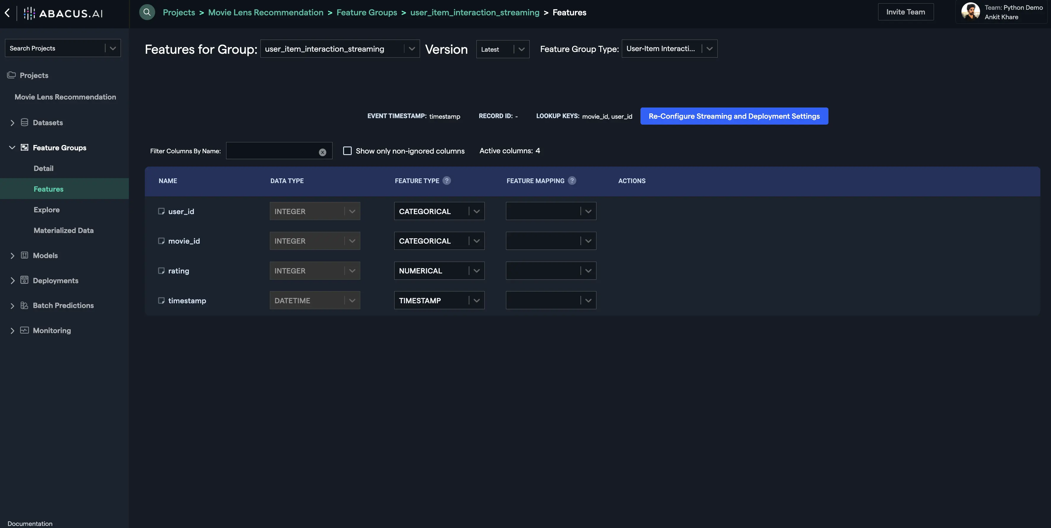 Streaming dataset configuration tells the system how to index the data so that it can be fetched effectively. The streaming datasets can be configured either via Lookup Keys or by using Record ID. The default configuration would be to use lookup keys where the key is used to fetch all the matching records. For example, an audit log where a user interacts with an item at a timestamp where (userID, itemID) can act as a lookup key, and the method appendData can be used to appends new records on the basis of the lookup key such that the old records are never overwritten or modified. At the time of fetching the records, the key would determine all the associated records to be fetched effectively. The second case is to set up a Primary Key, which means you need only ONE record per id. Imagine a user table that has a userId and for every user, there exists only one set of attributes. In such cases indexing the data with a primary key is suitable. The method upsertData can be used to create a new row if the ID doesn't exist already, otherwise, the existing record will be updated. While fetching the data, it becomes effective to retrieve the row on the basis of the key since the system is already configured such that each ID is associated with only one record. Let's illustrate how you could configure these settings using the Abacus.AI console: