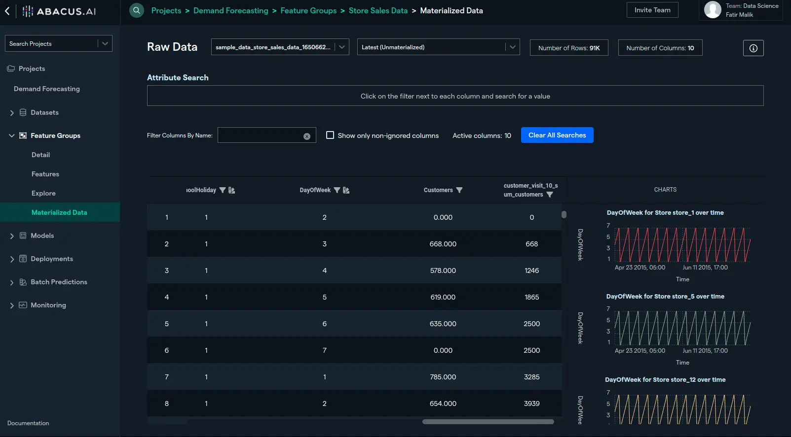 - To view the feature, we can go to the 'Materialized Data' and verify the intended behavior. The right-most column, 'customer_visit_10_sum_customers', shows the sum of customers visiting the store in the last 10 days: