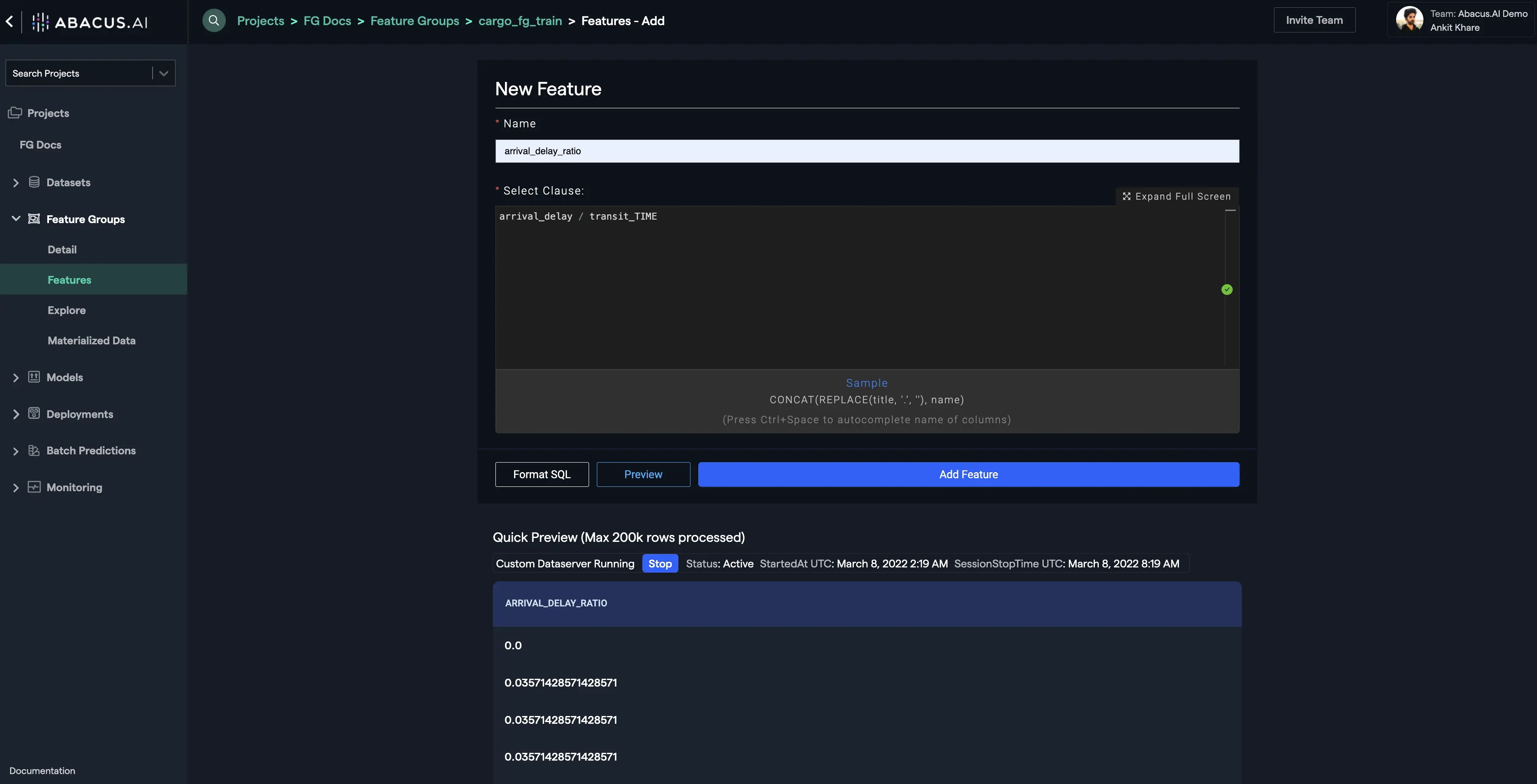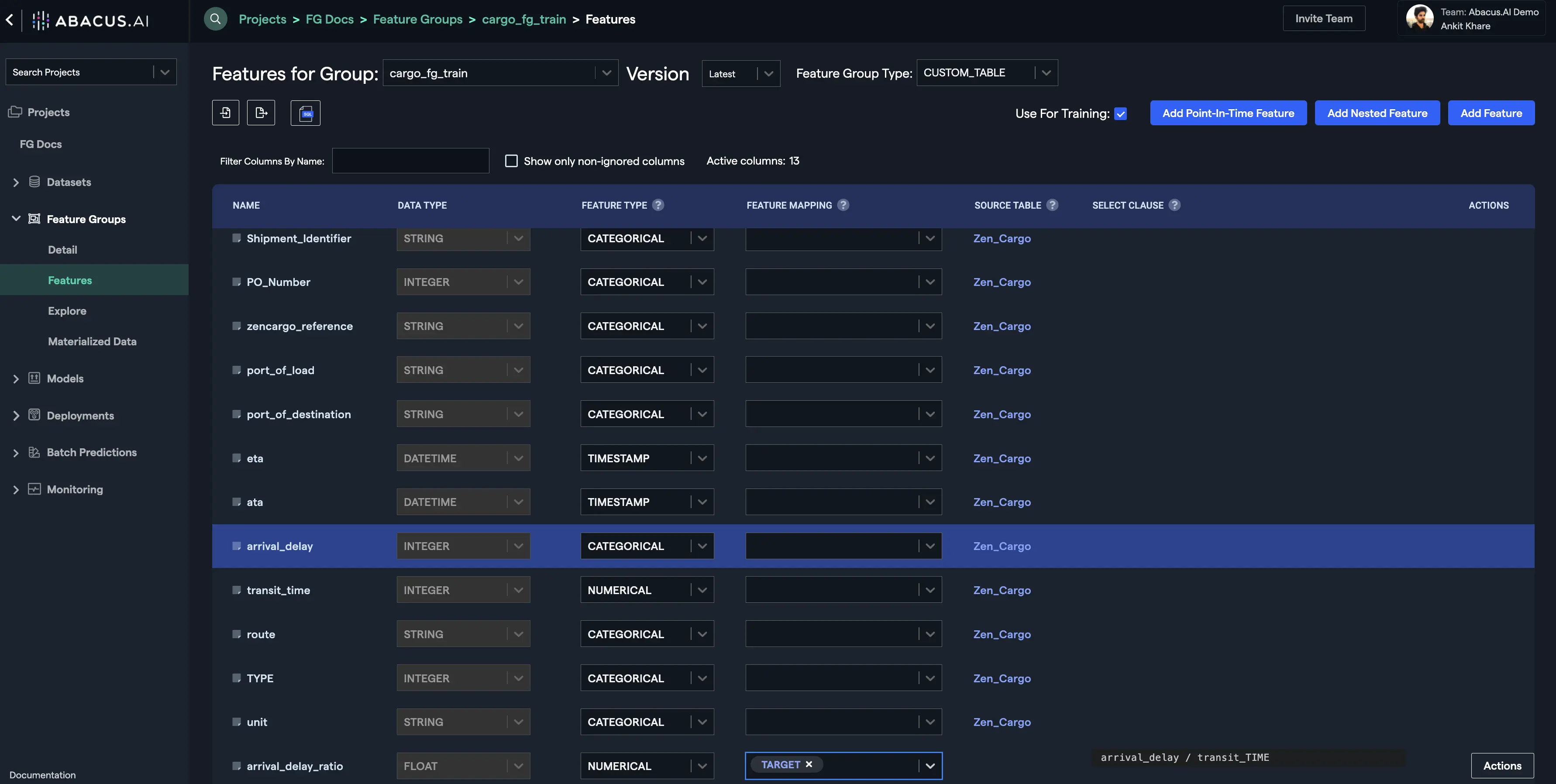 In the running example, let's say you need to predict the ratio of arrival_delay / transit_time. This can be done by adding a new feature under the "cargo_fg_train" feature group. On the left menu, select "Features" option under "Feature Groups". Now click on "Add Feature" button: