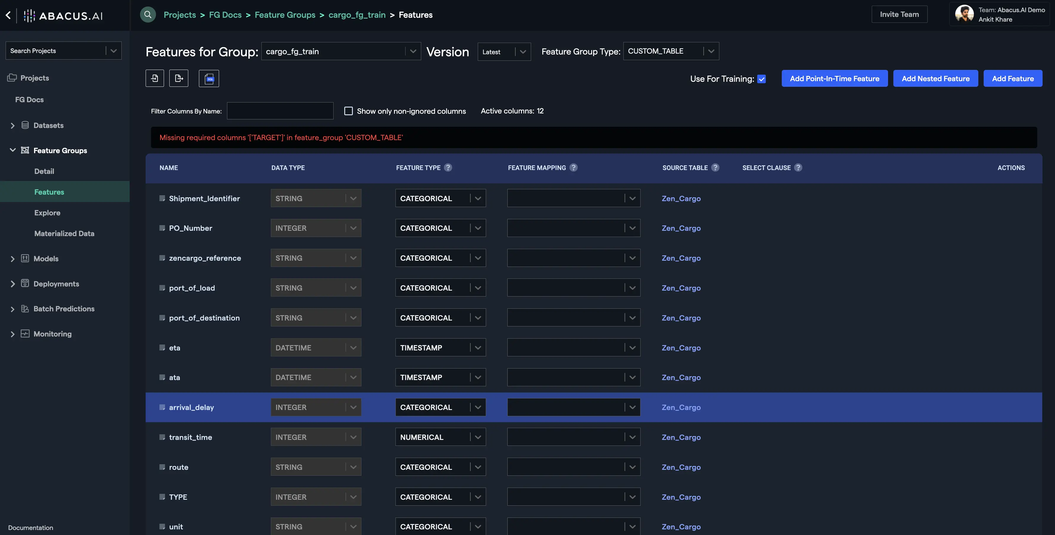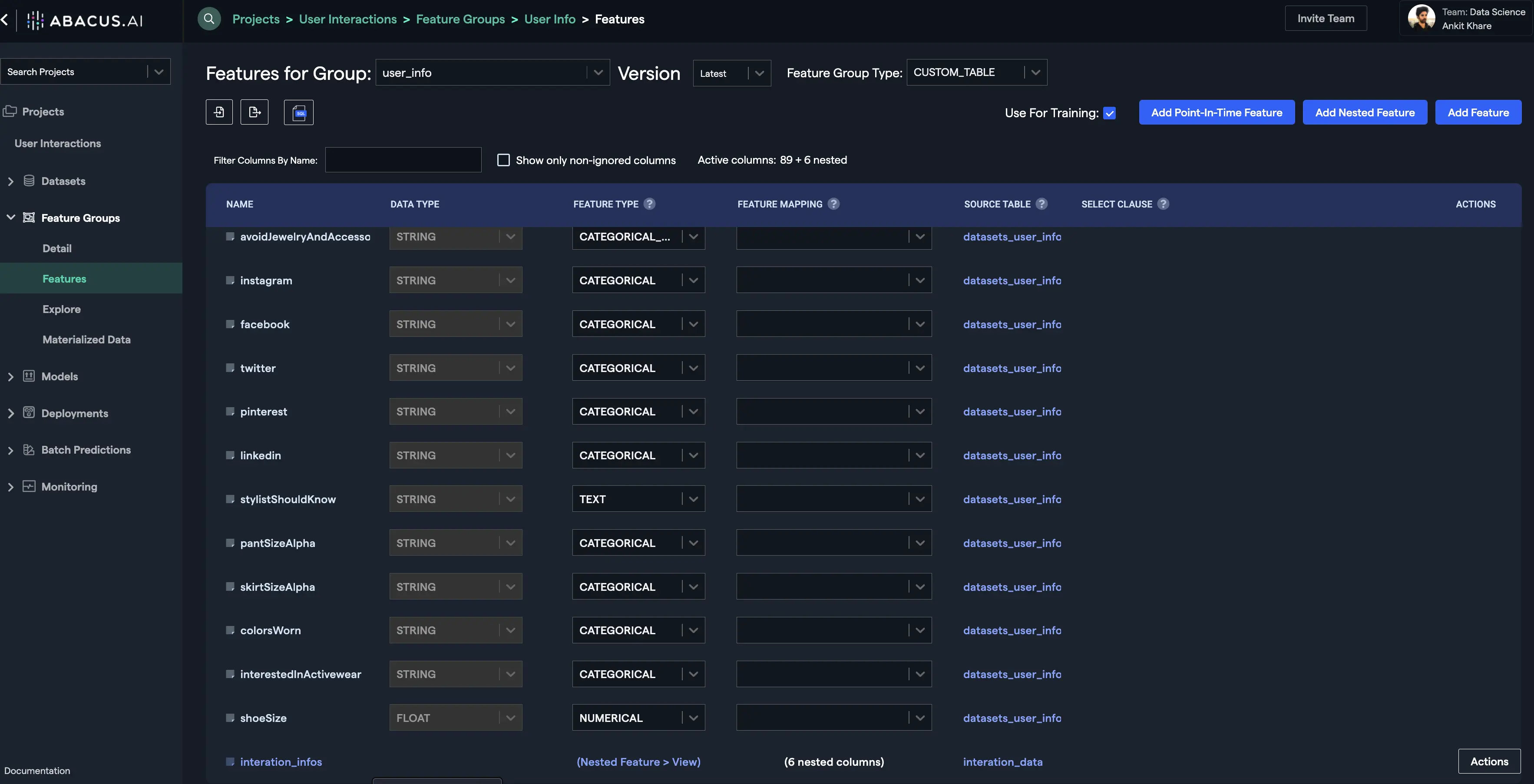 Real-world Machine Learning applied at enterprise data involves complex feature engineering steps. Flat tables are seldom sufficient to represent all the information needed to produce insights or predictions. Although, flat tables are good at capturing the static features within the training data, certain dynamic features are difficult to represent with flat tables. For instance, if you are trying to predict the probability of a user to churn, the flat table can represent the static attributes of the user such as age, geography, device, etc., however, dynamic features such as browsing activity, payment history, etc., cannot be captured easily using flat tables. Although you can manually engineer features for flat tables, but it is time consuming, error prone, and often does not allow ML algorithms to capture maximum information. This is where Abacus.AI's Nested Features comes into play. At the training stage, our AutoML and deep learning models are designed to extract maximum information from Feature Groups and Nested Feature Groups.