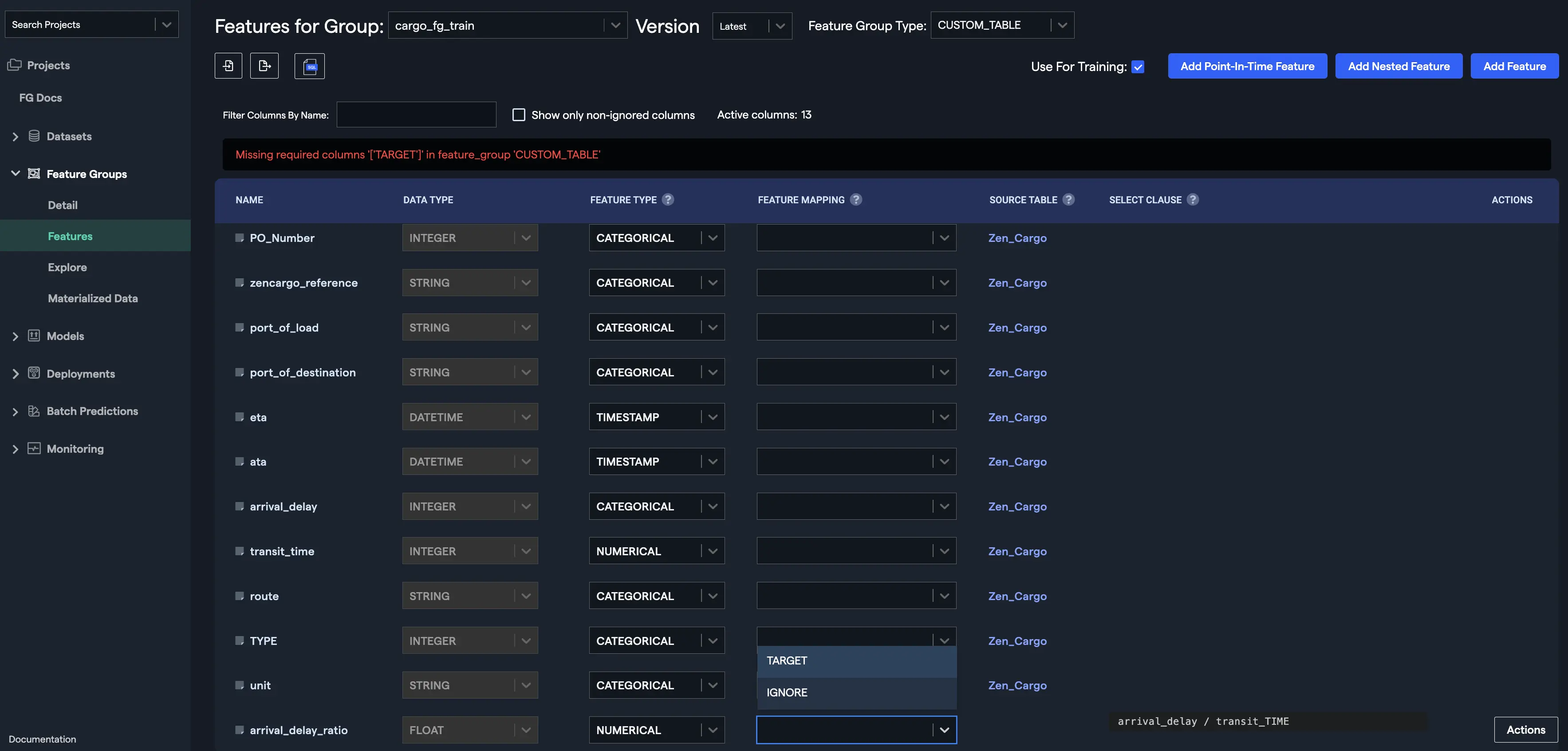 - Your new feature will be displayed at the bottom of the features list. You can provide a feature mapping to your new feature if required. In this example, the "TARGET" feature mapping is selected for the newly created feature and this also resolves the missing required columns error: