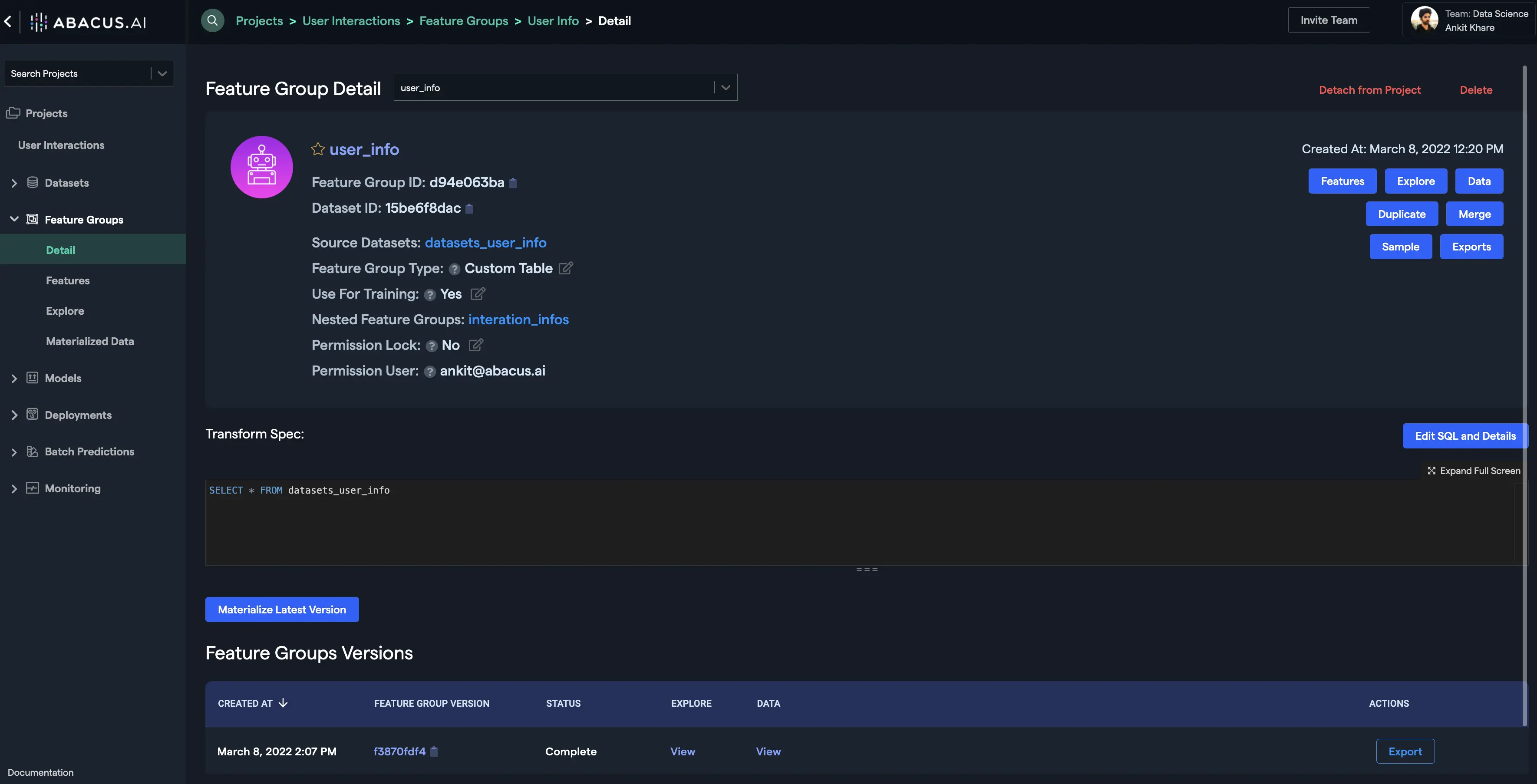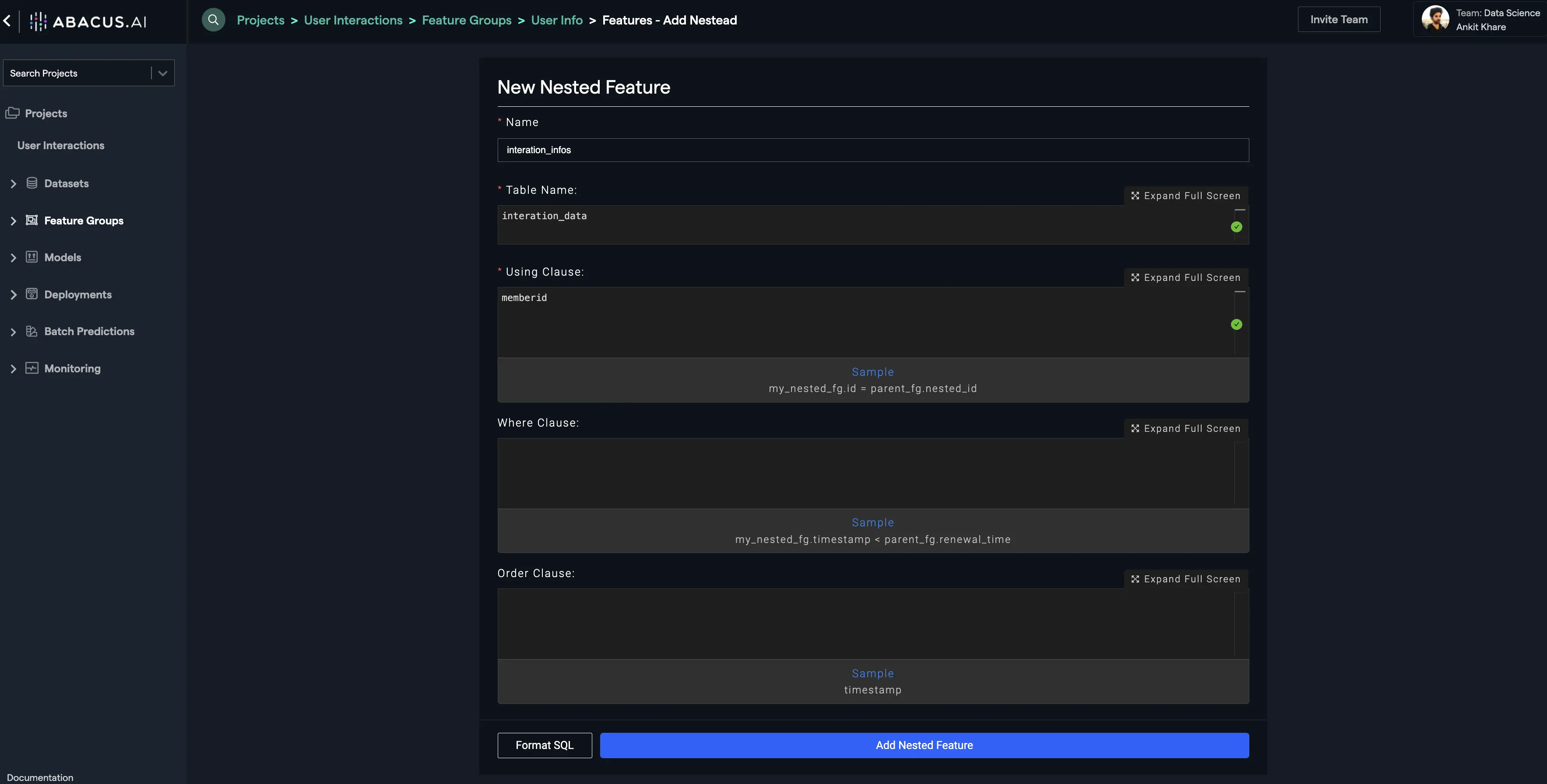 The first step is to click on the "Feature Groups" tab at the left navigation and select the "Features" sub-tab. Make sure that you have selected the user_info feature group at the top. Next, Click on the "Add Nested Feature" button. Enter the name of the feature group, the table to be referenced for creating the nested feature group (interaction_data for the current example), and the column/feature to be used under "Using Clause" as shown below: