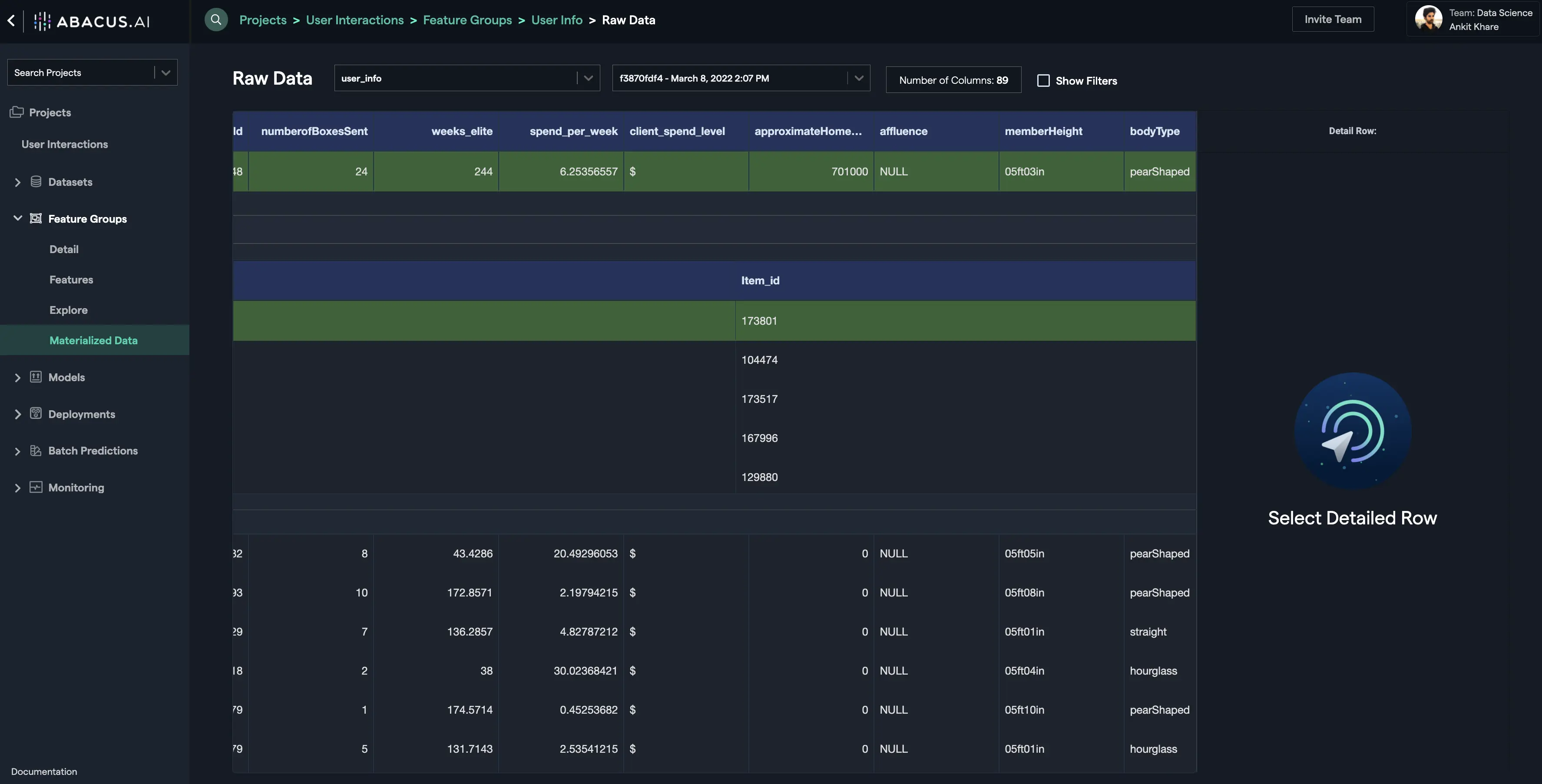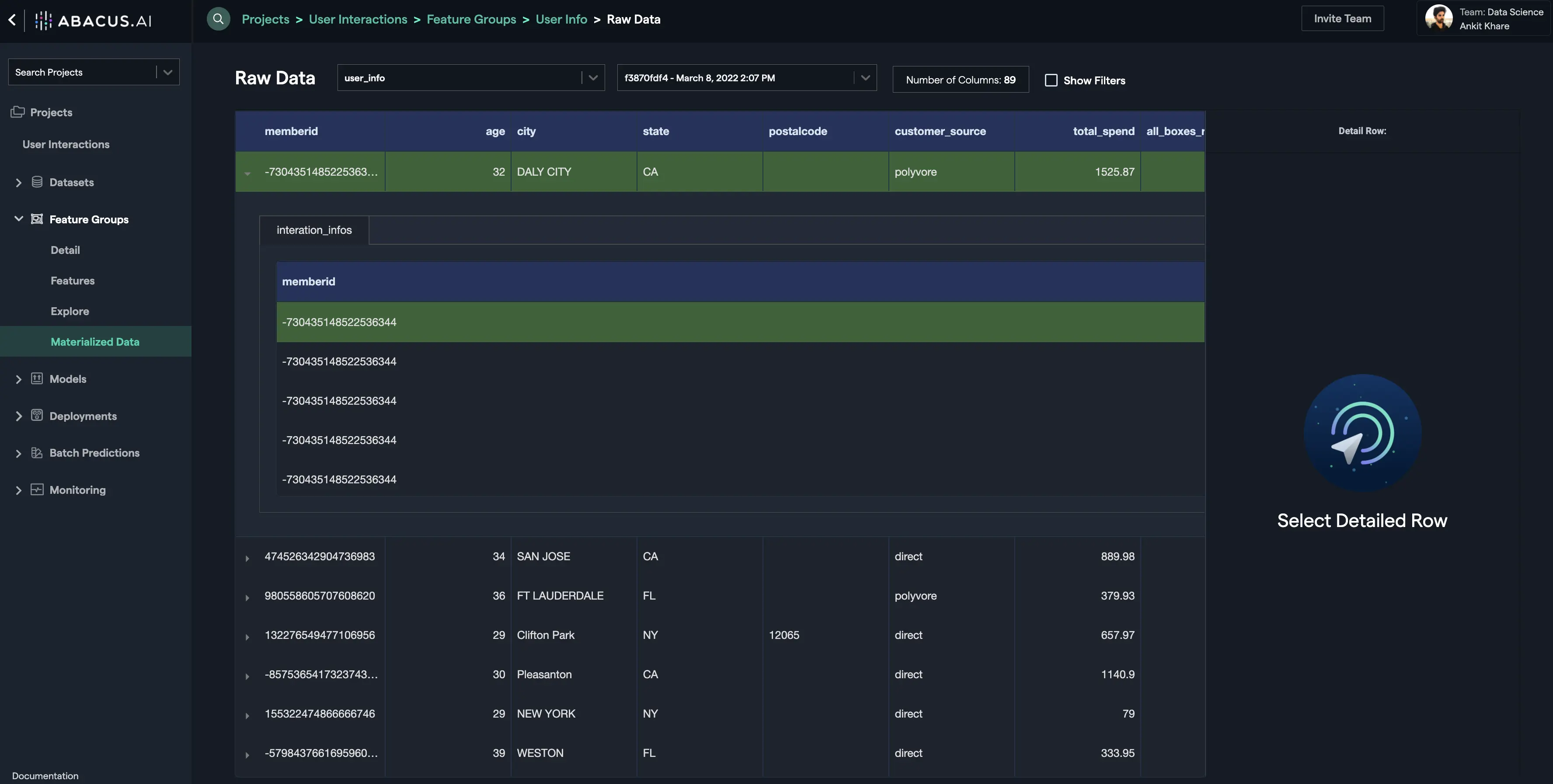 - Notice the downward pointing arrow on the rows. Click on any of them to see the nested feature group data for that row: