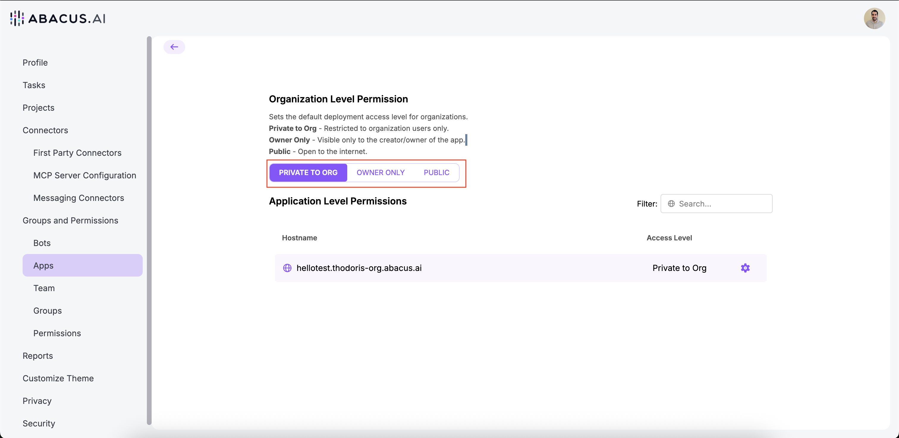 From this dashboard: https://your-workspace.abacus.ai/chatllm/admin/permissions/, organization admins can restrict who can actually share applications.