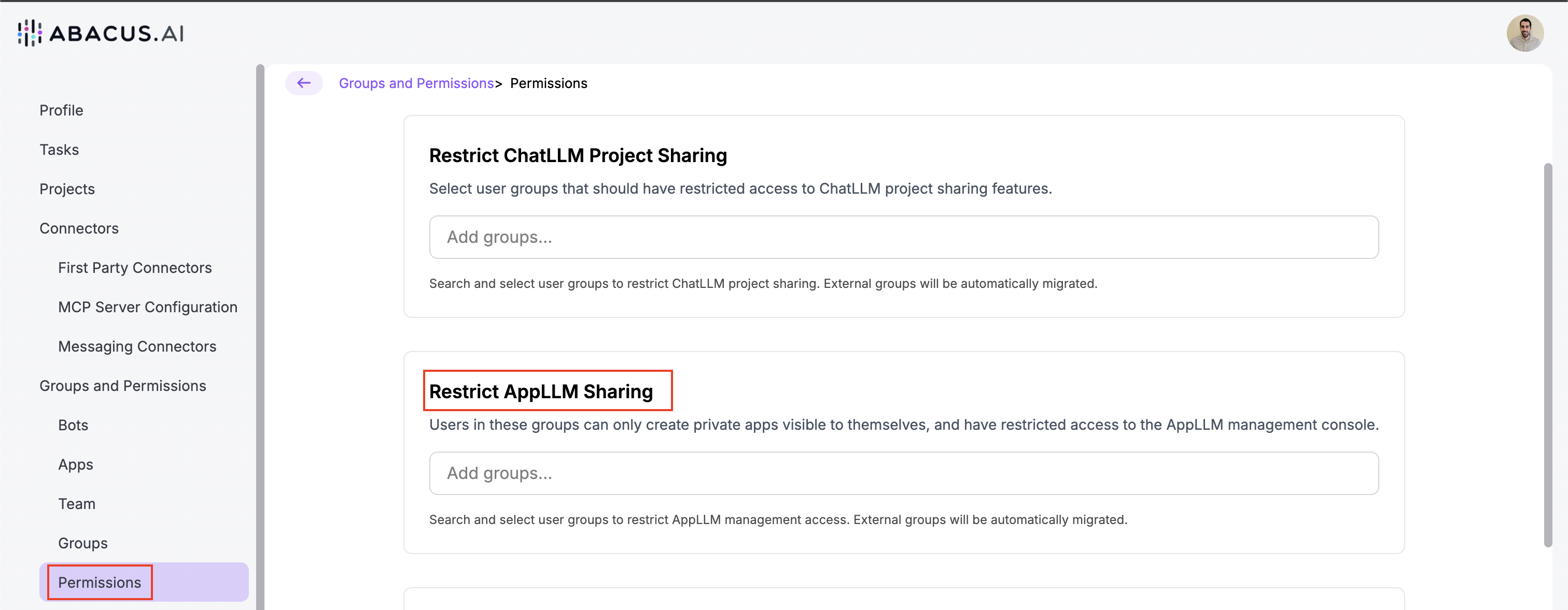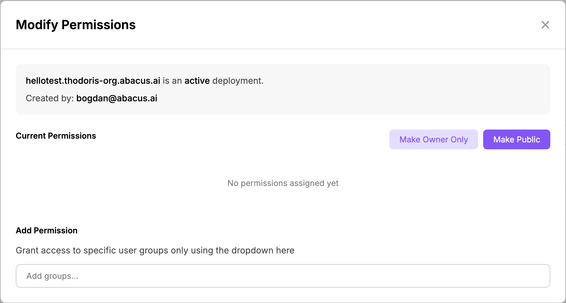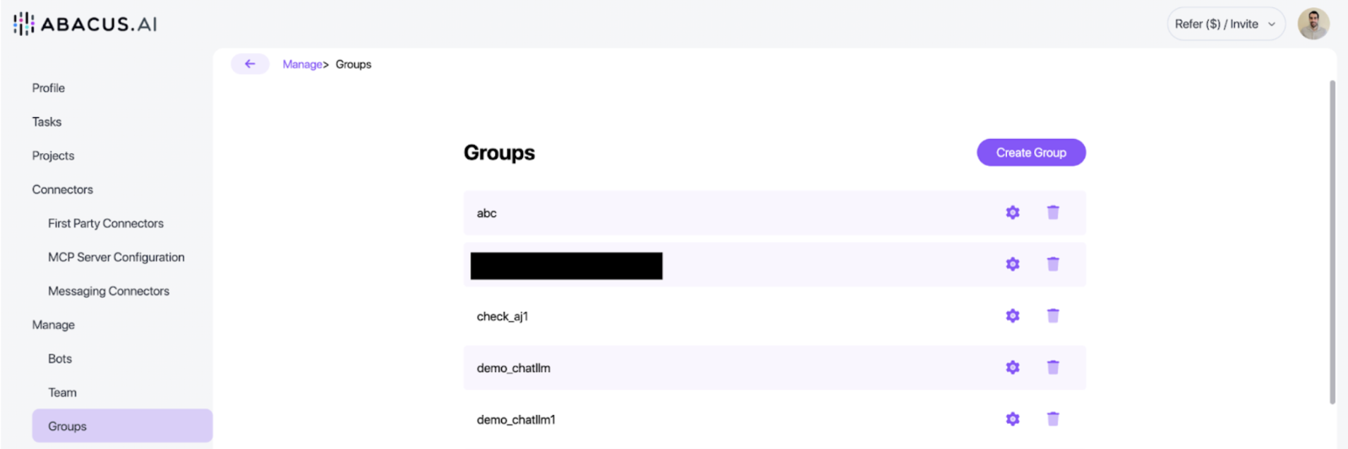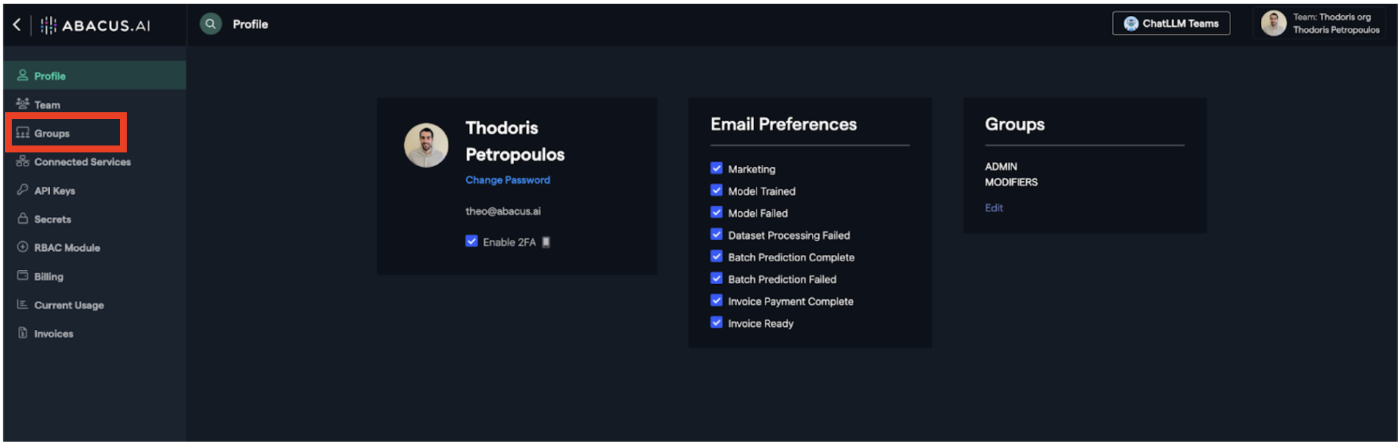 Abacus.AI allows you to create native groups or manage groups through Azure Active Directory. All instructions below apply to both native Abacus groups and Azure AD groups.