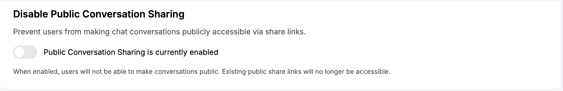 By default, anyone with a shared conversation URL can access it directly, as long as he is also a part of the same organization. This behavior can be configured using the option below: