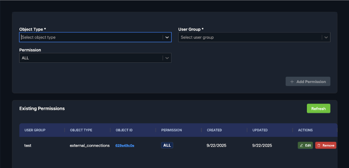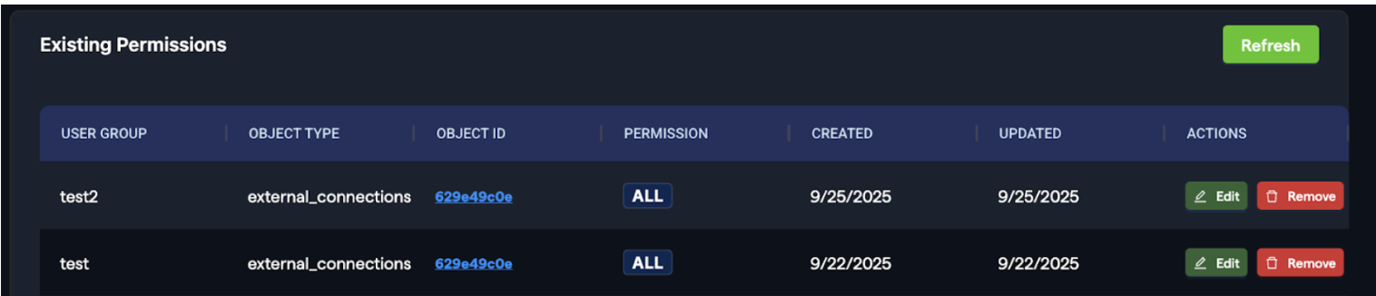 When users from the test group interact with this connection, they can modify it. In contrast, users from the test2 group only have view access and cannot make changes.