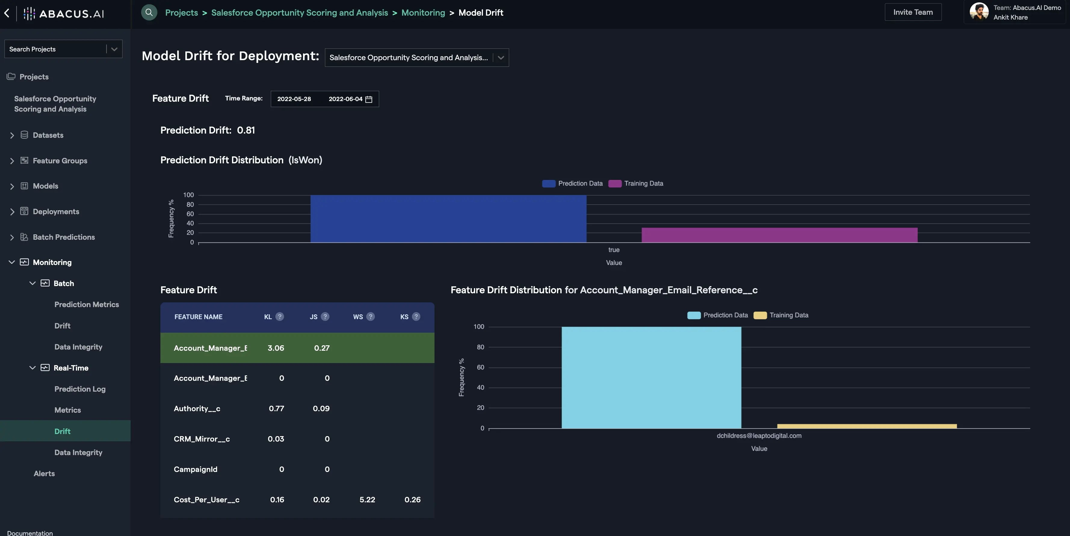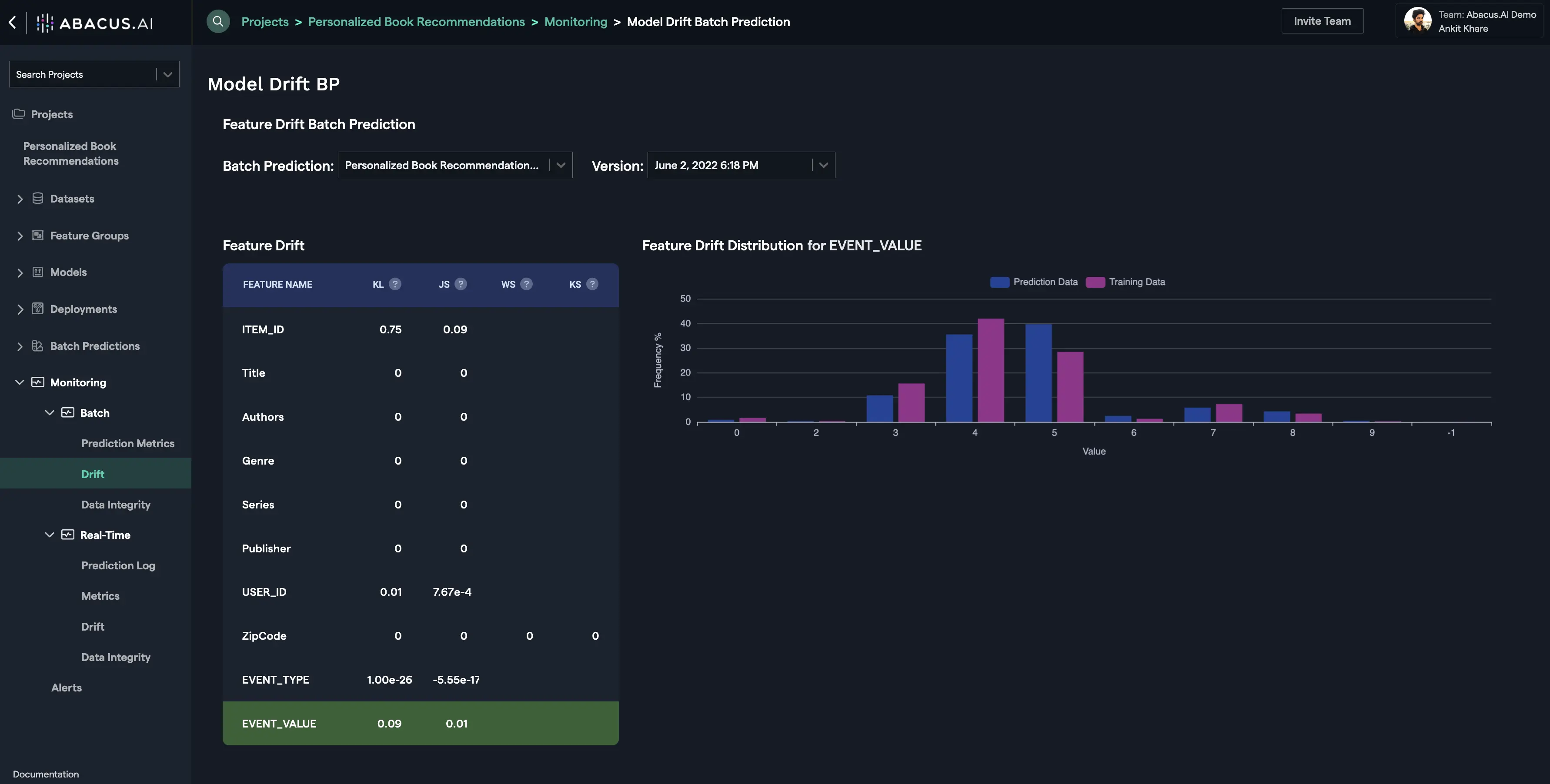 Batch Drift is tied to the Batch Prediction versions. For each batch prediction version, feature drift is calculated for each feature. Depending upon the problem type and the availability of actual values for the prediction data, prediction drift is calculated.