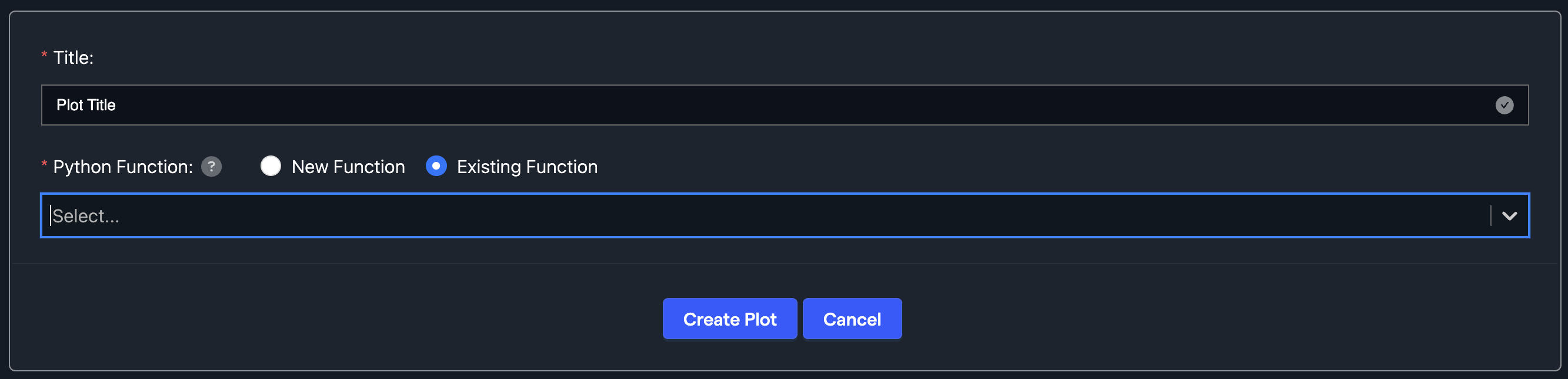 - Provide the plot's title and function name. Once you click the Create Plot button, you'll be redirected to the embedded notebook to create the plotting function and register it within the dashboard. More details are provided in the API approach.