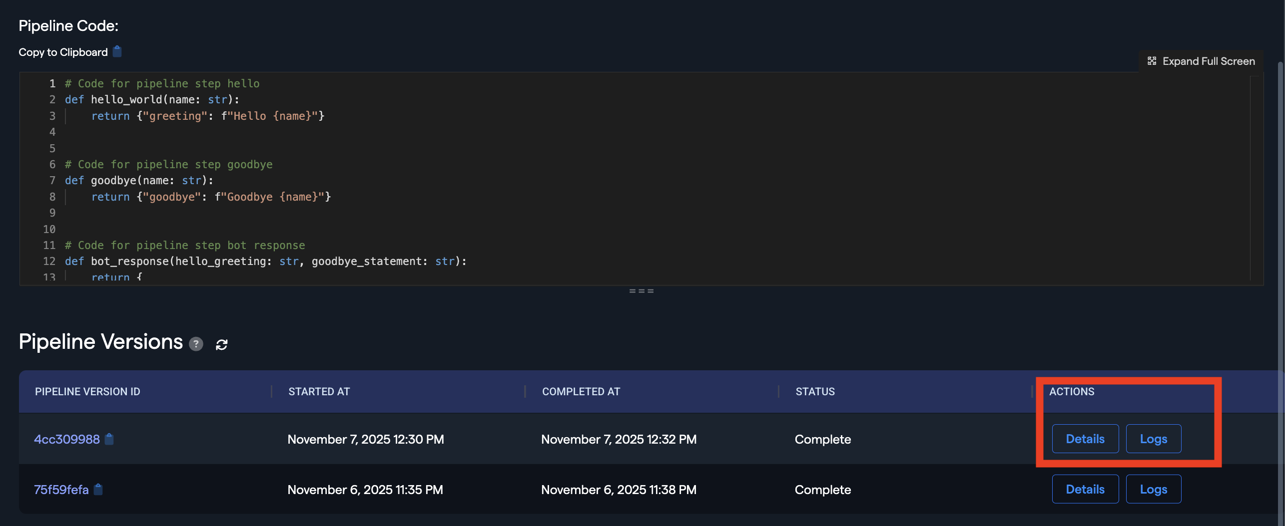 At the bottom of the pipeline screen, you can view historical pipeline runs. If you used a logger or print statements in your code, you can view the output in the Logs section.