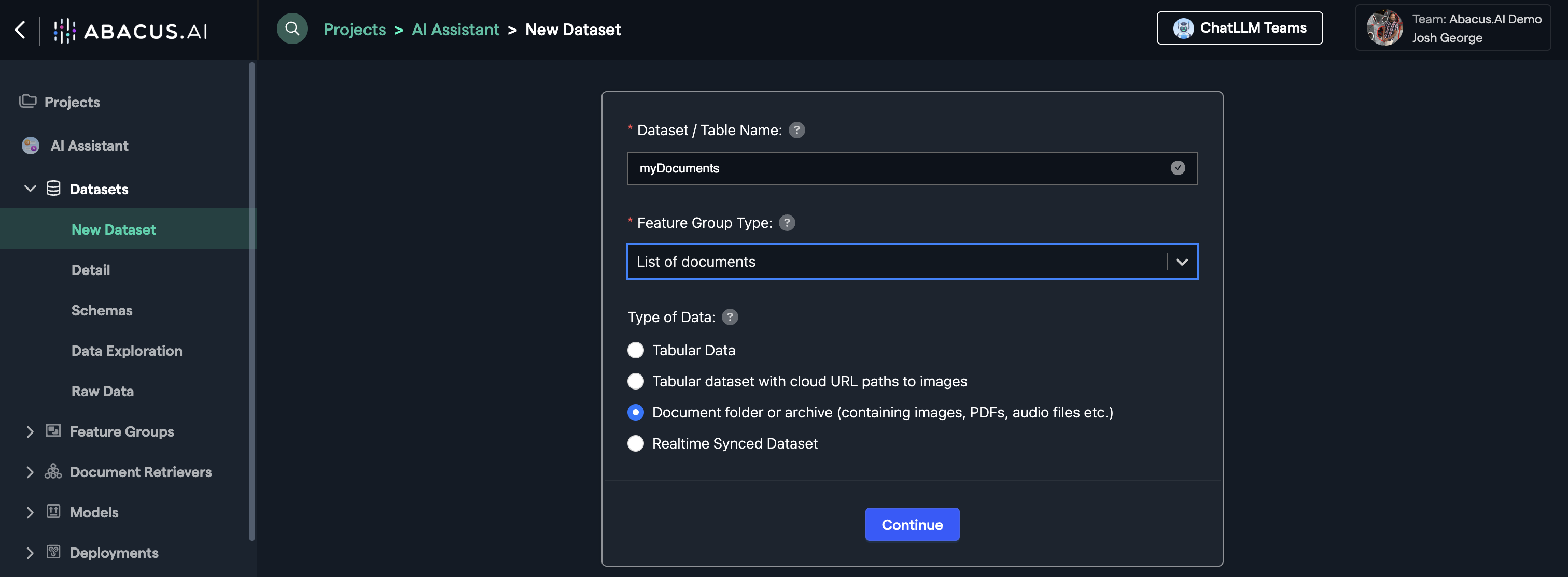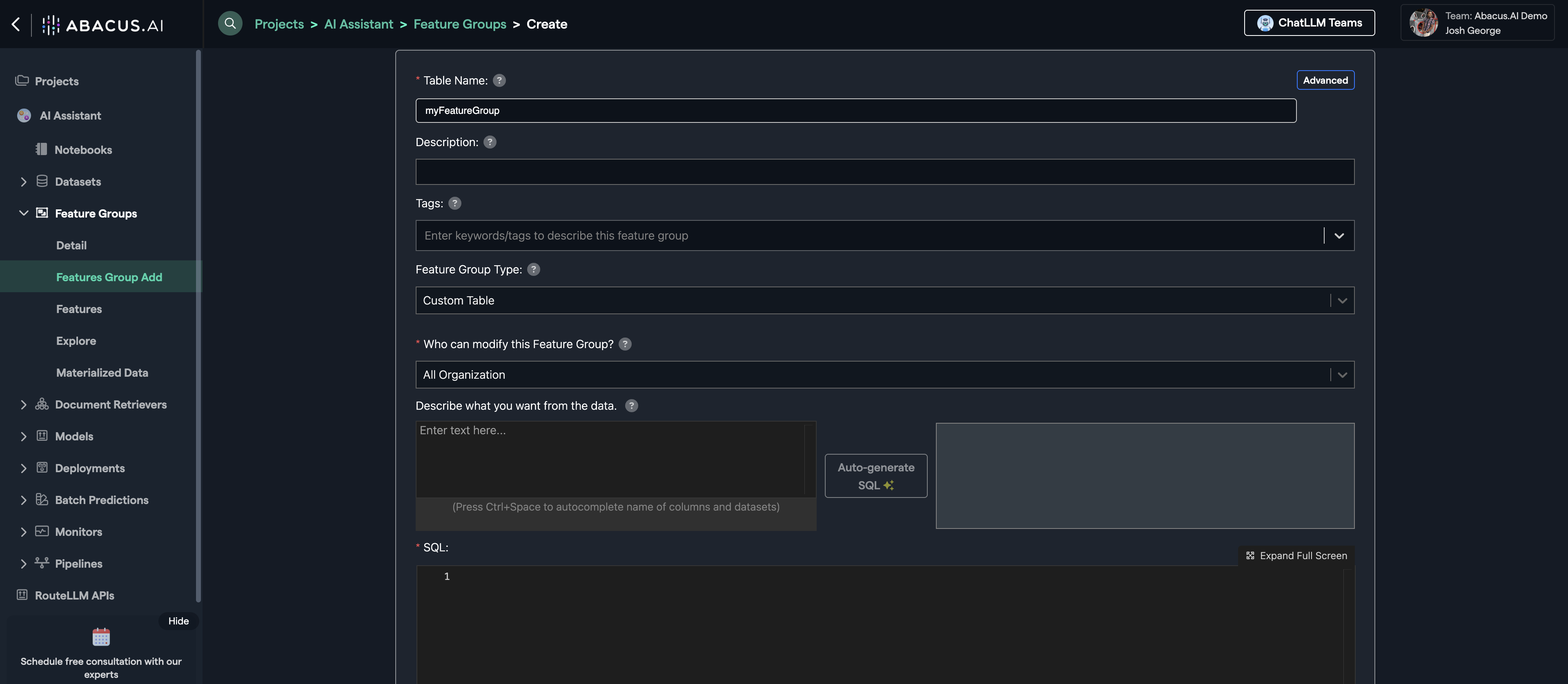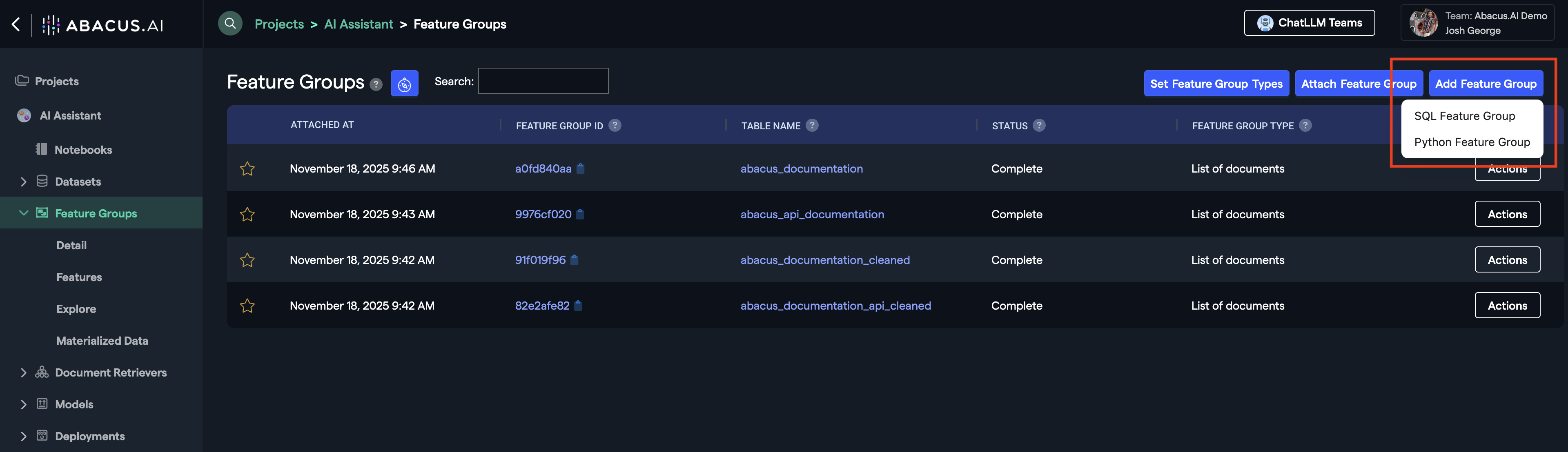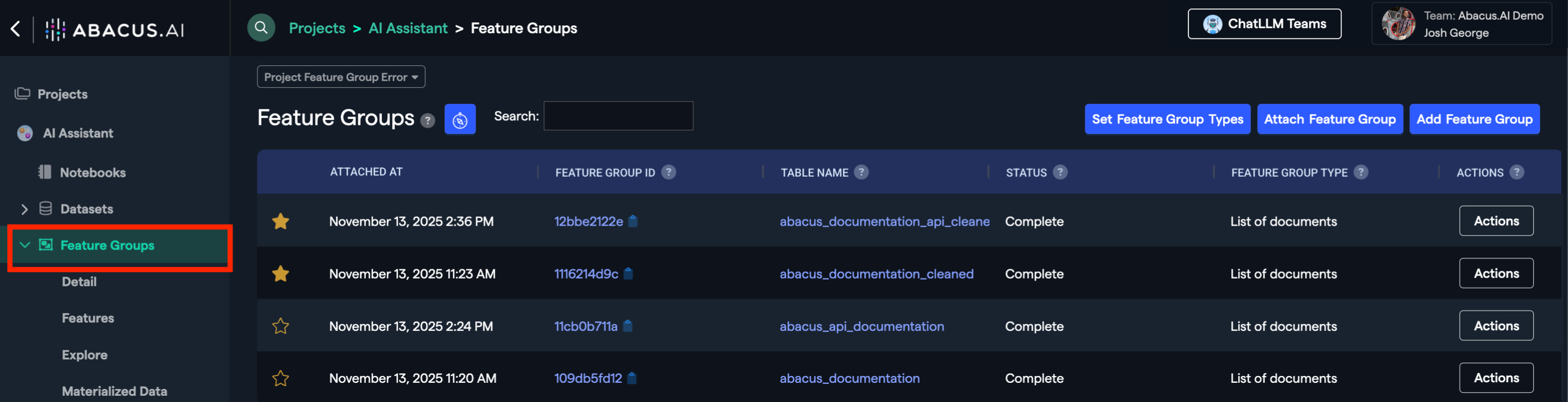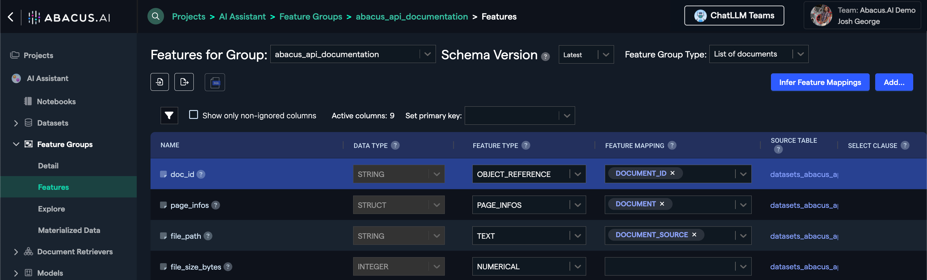 Once Abacus has finished inspecting the dataset, click on the Feature Groups section in the left panel to manage and configure your dataset.