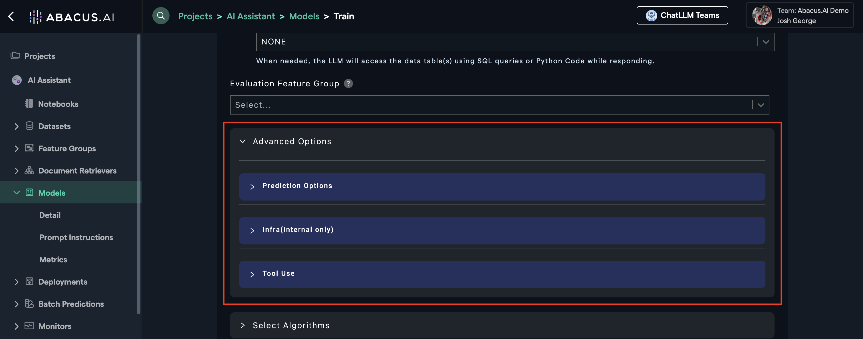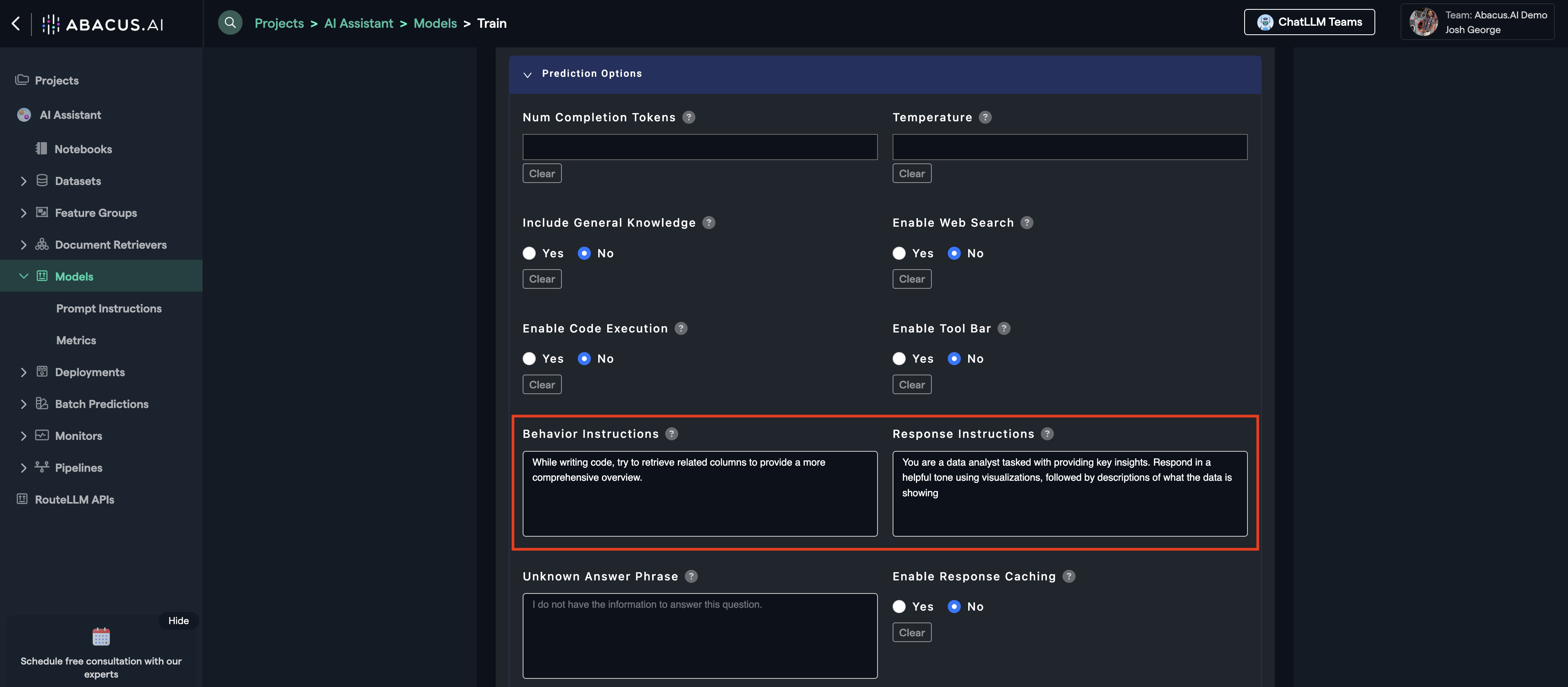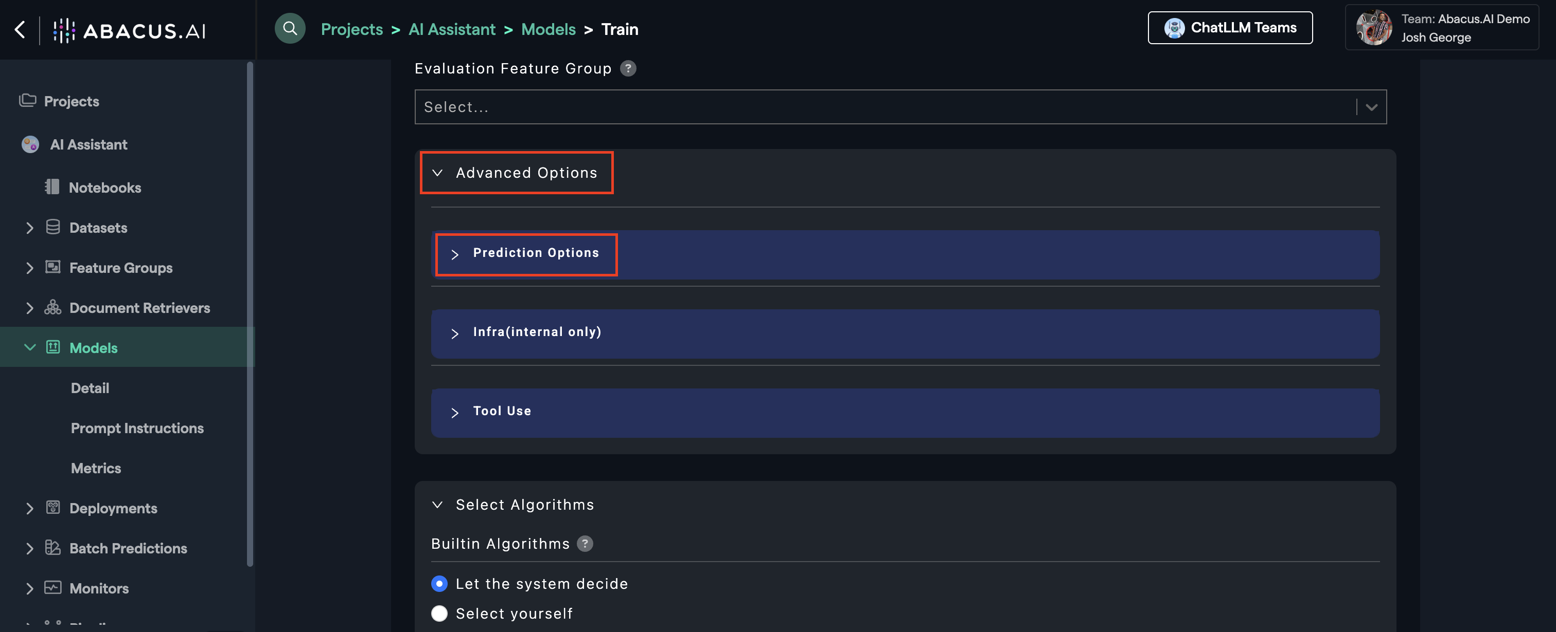 In cases where you want to influence how your model will respond to prompts, navigate to Advanced Options --> Prediction Options.