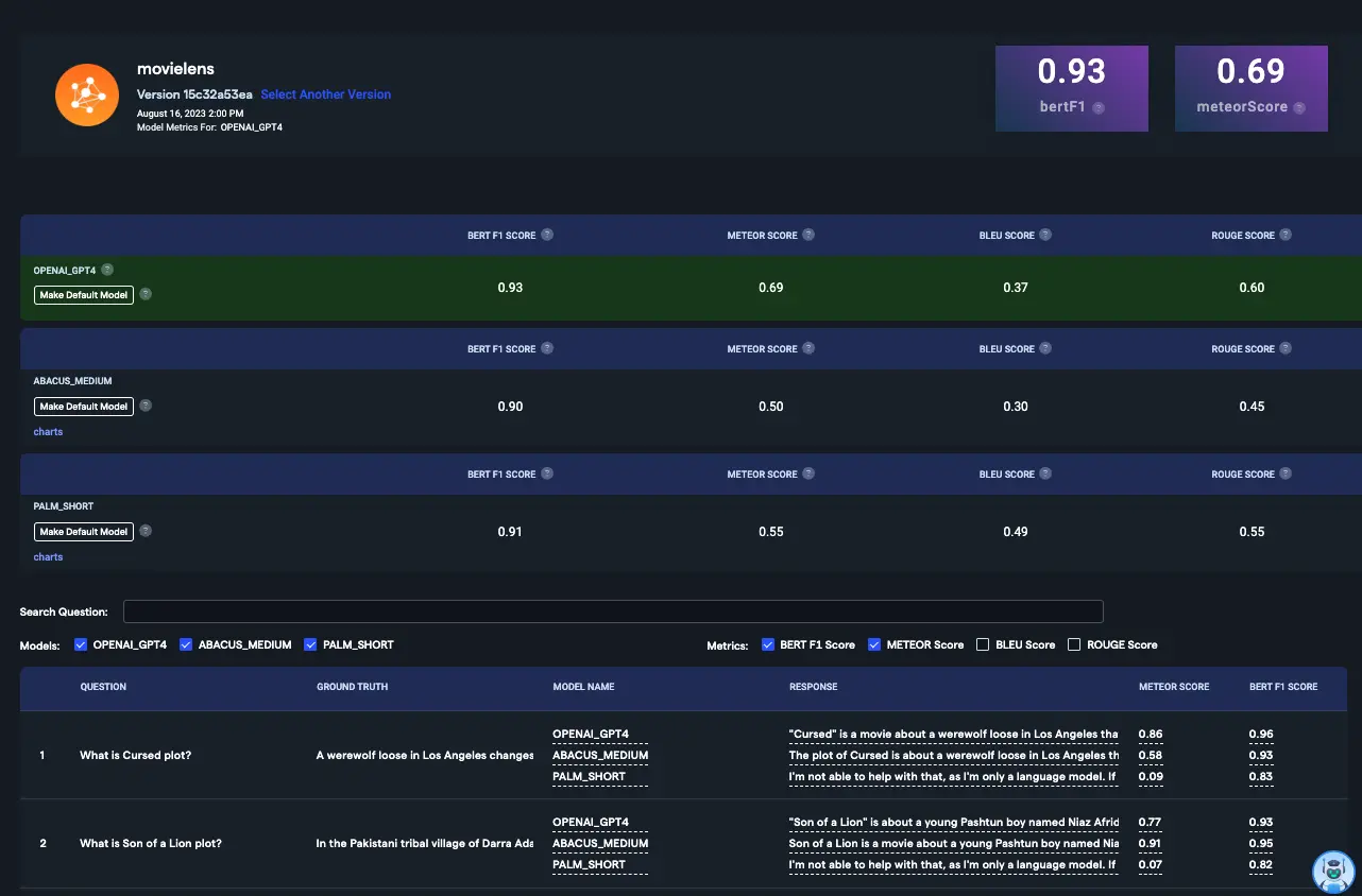 Compare metric scores across different models. For all scores, the ideal value is 1.0. Higher scores indicate closer matches to ground truth. With well-matched evaluation questions, expect a BERT F1 score between 0.7 and 1.0.