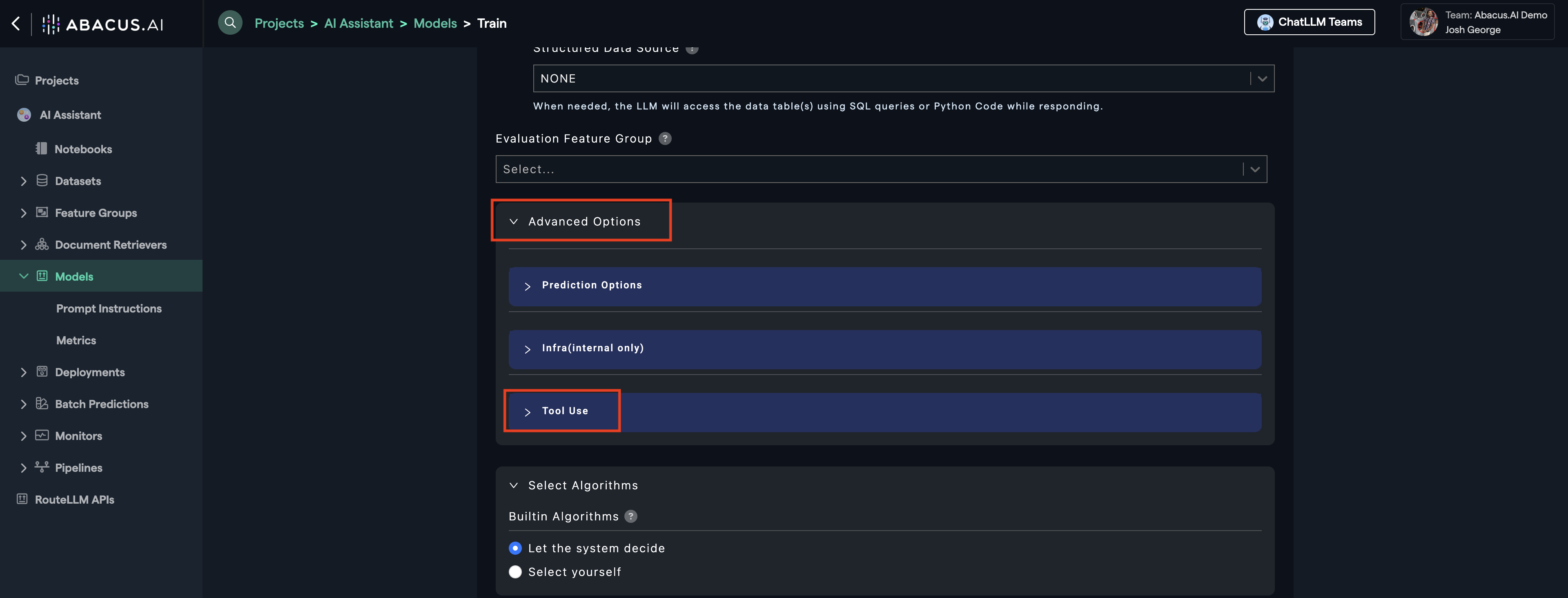 In cases where you want to add a tool to your chatbot, just navigate to: Advanced Options --> Tool Use and choose the tool(s) you are interested in.
