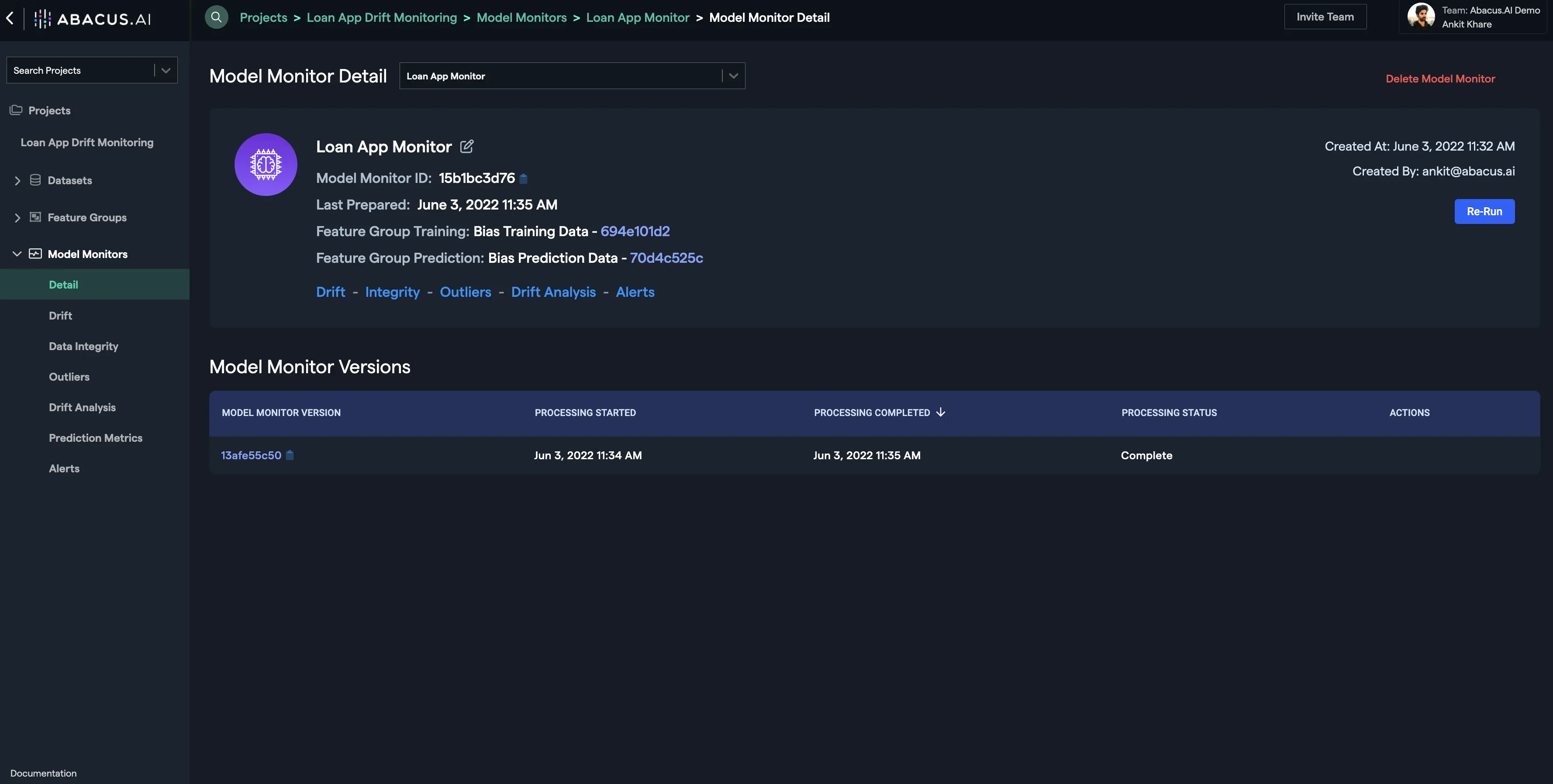Once the processing finishes, you will see be able to see the model monitor details and utilize all the functionalities under the option "Model Monitors" at the left navigation: