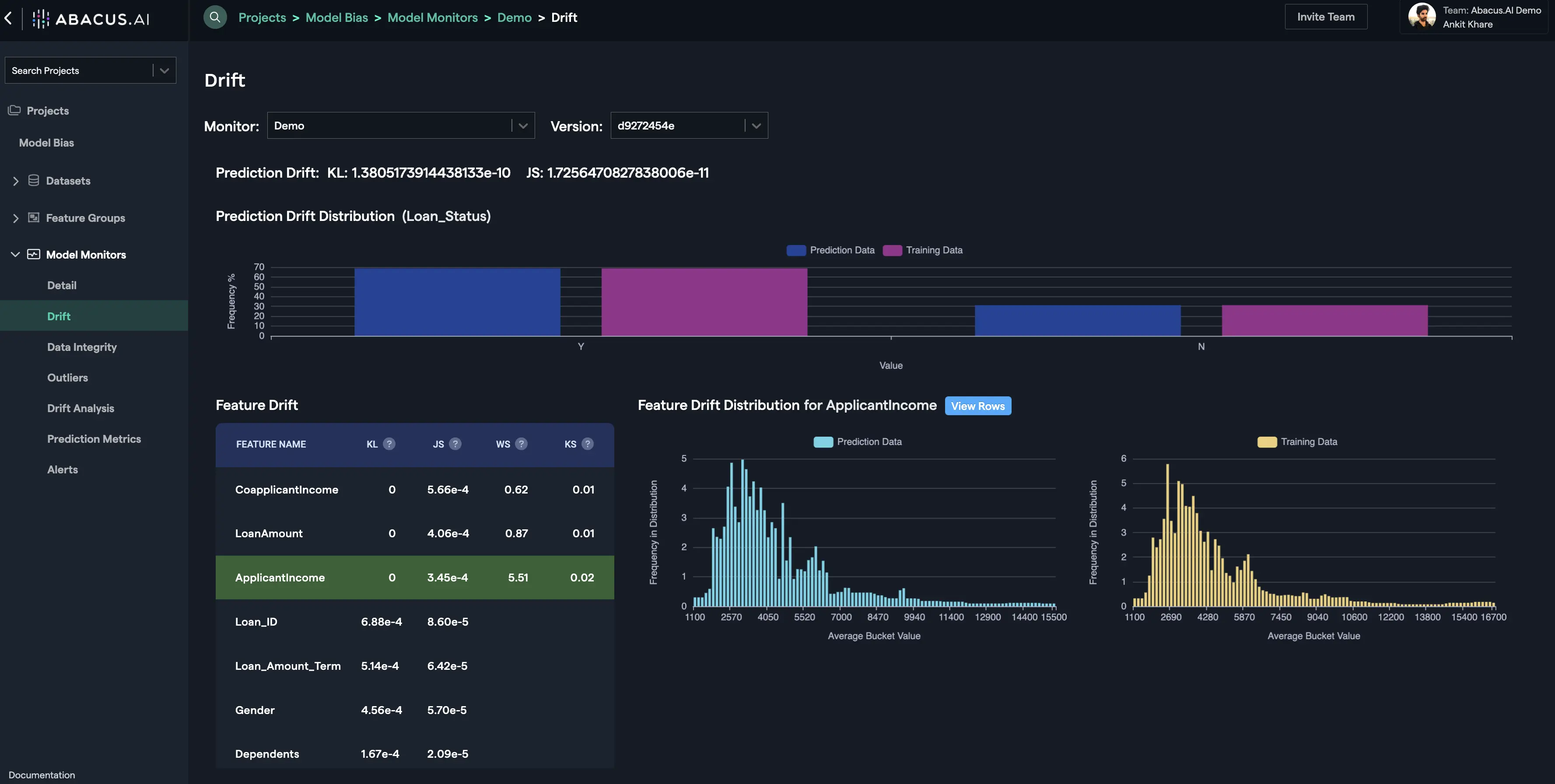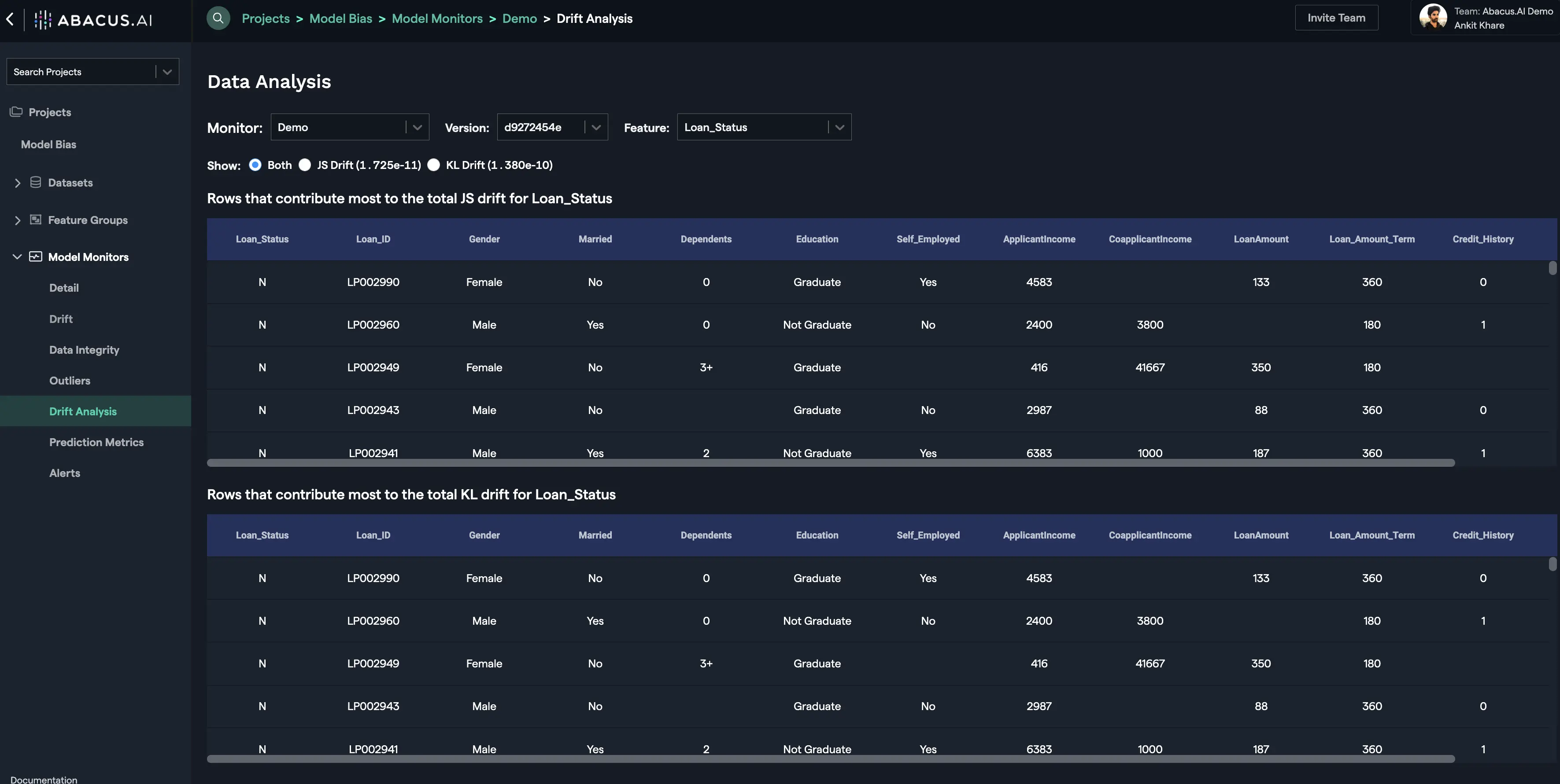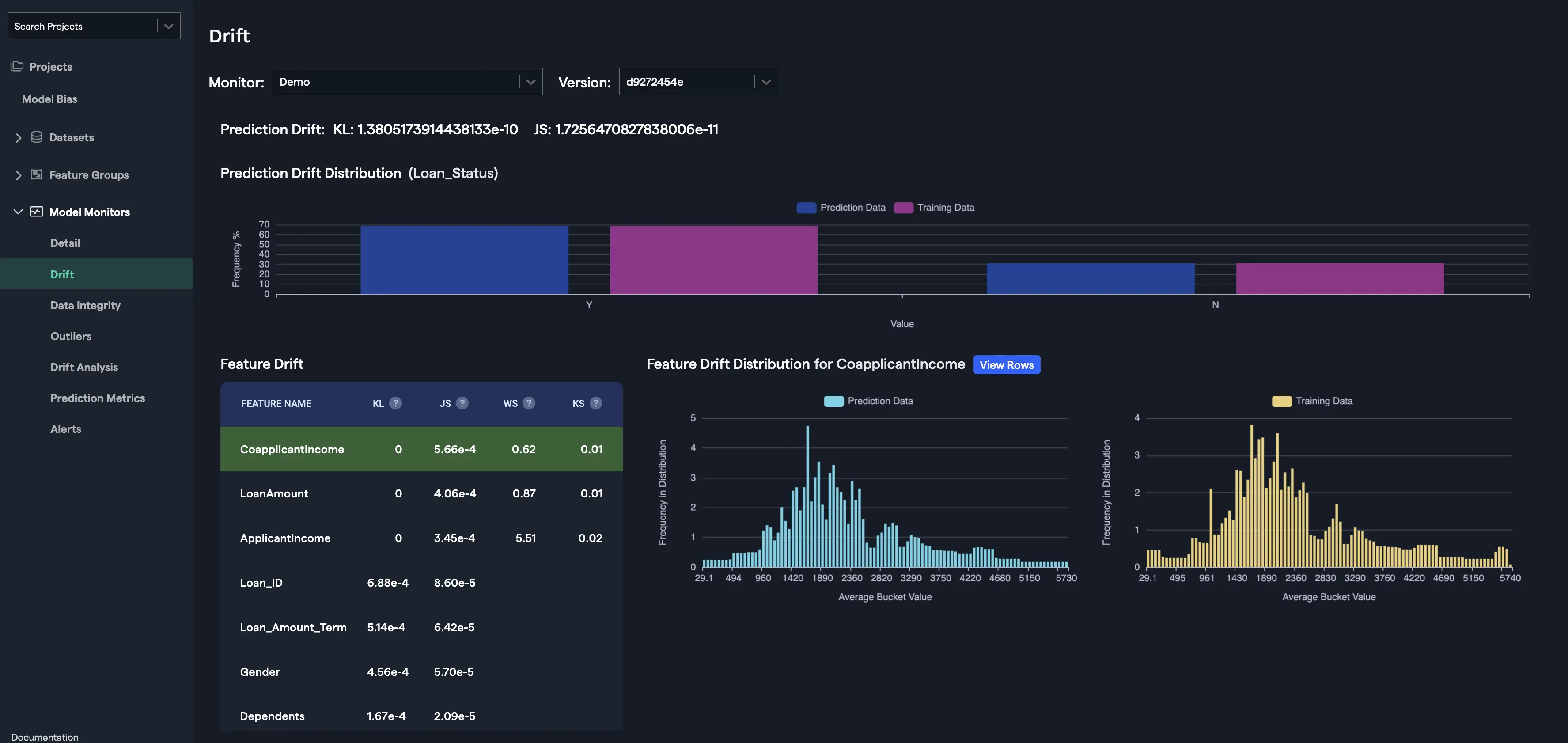 The rows / records that contribute most to the drift for the feature are displayed in the drift analysis interface. For each feature you will have the option to see the records that contribute the most for KL Drift and/or JS Drift. You can click on the "View Rows" button to go to the drift analysis interface for the particular feature or you can select the "Drift Analysis" option from the left navigation to see the drift analysis for any feature: