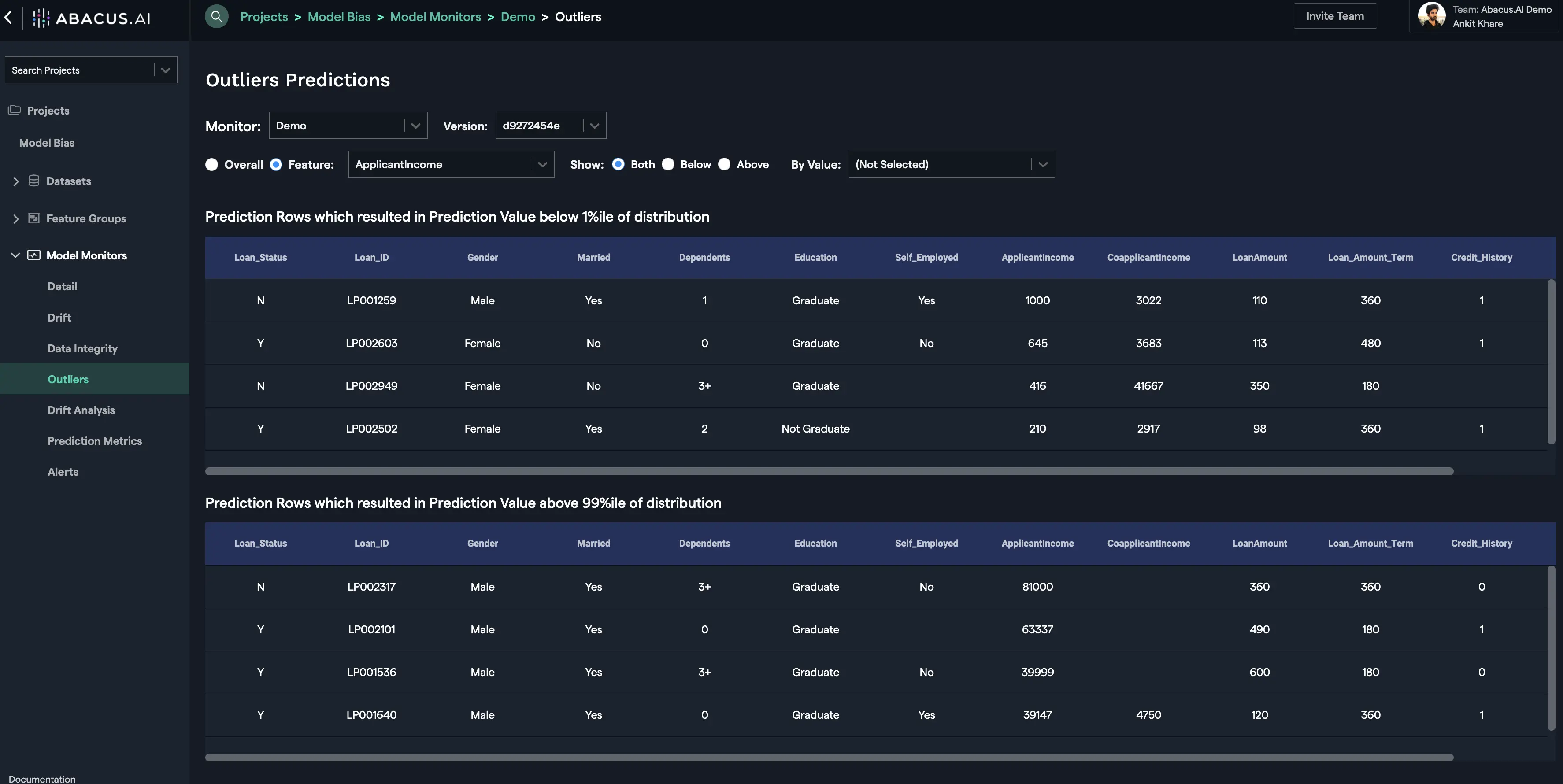 For the feature outliers, prediction rows that resulted in prediction value below 1 percentile of distribution and/or above 99 percentile of distribution are displayed: