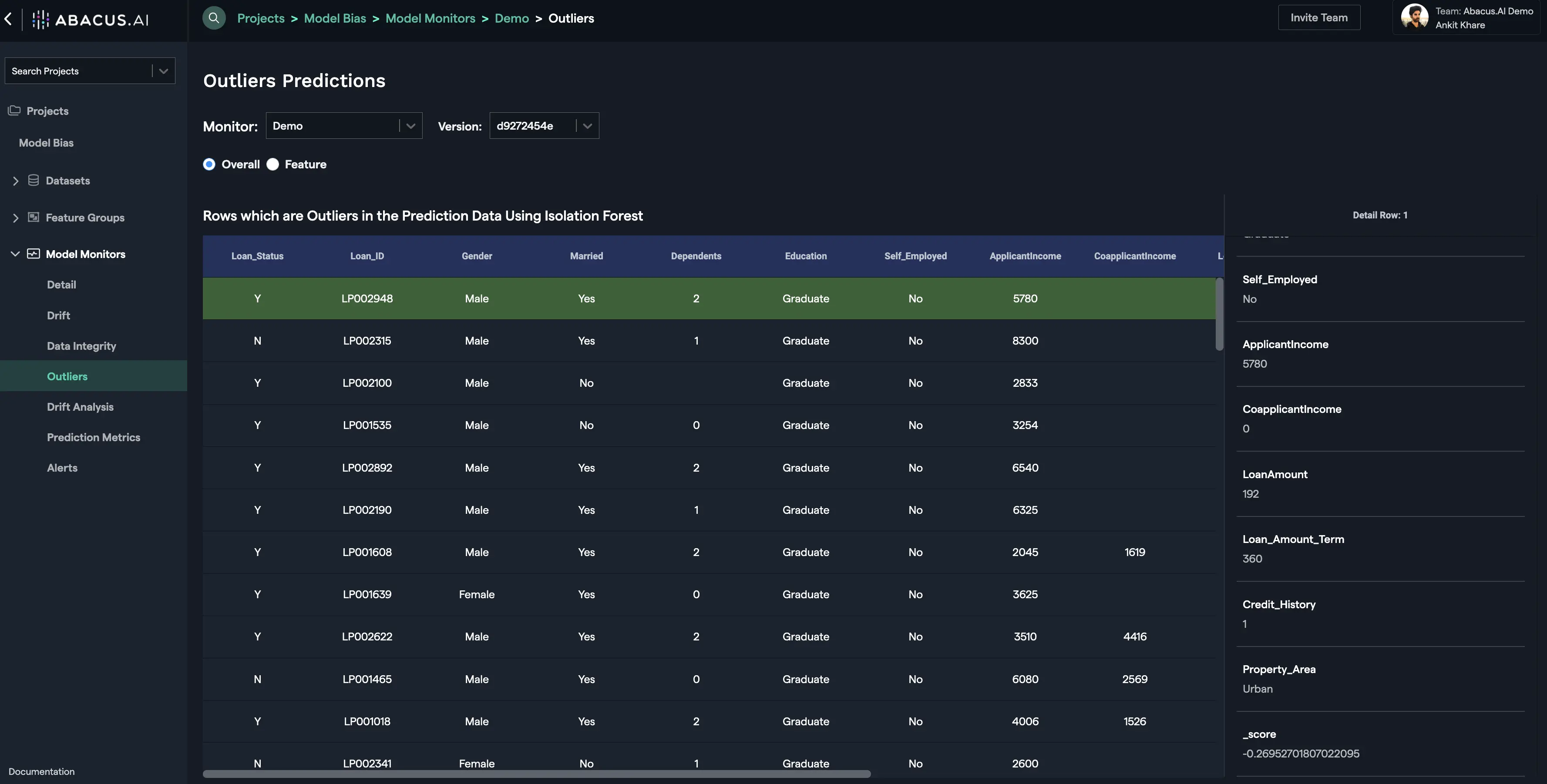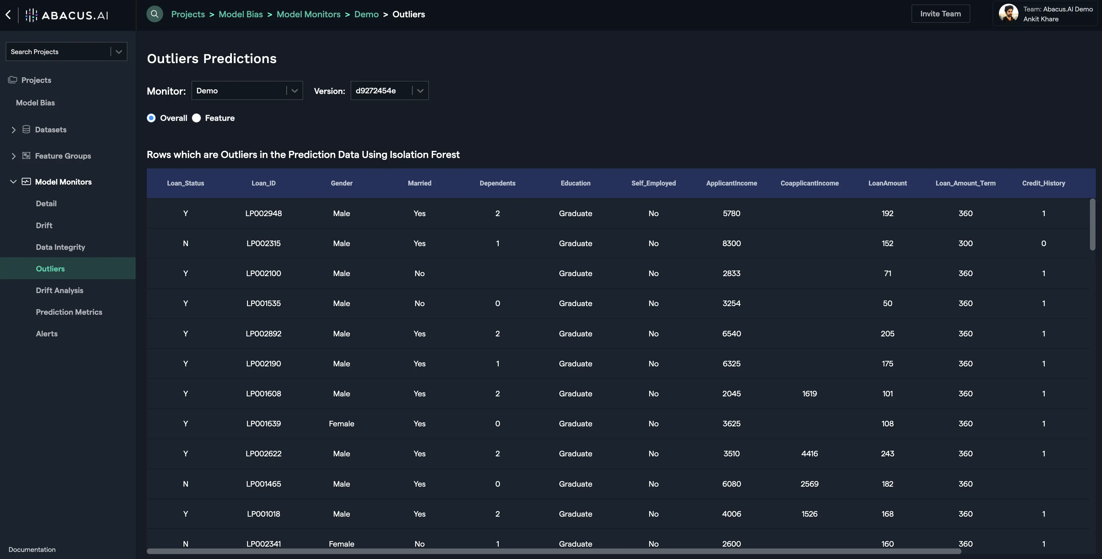 This interface displays the outliers within the prediction data. There are two options available to monitor outliers: Overall and Feature. Overall option displays the anomalous rows (outliers) in the prediction data using the Isolation Forest method.