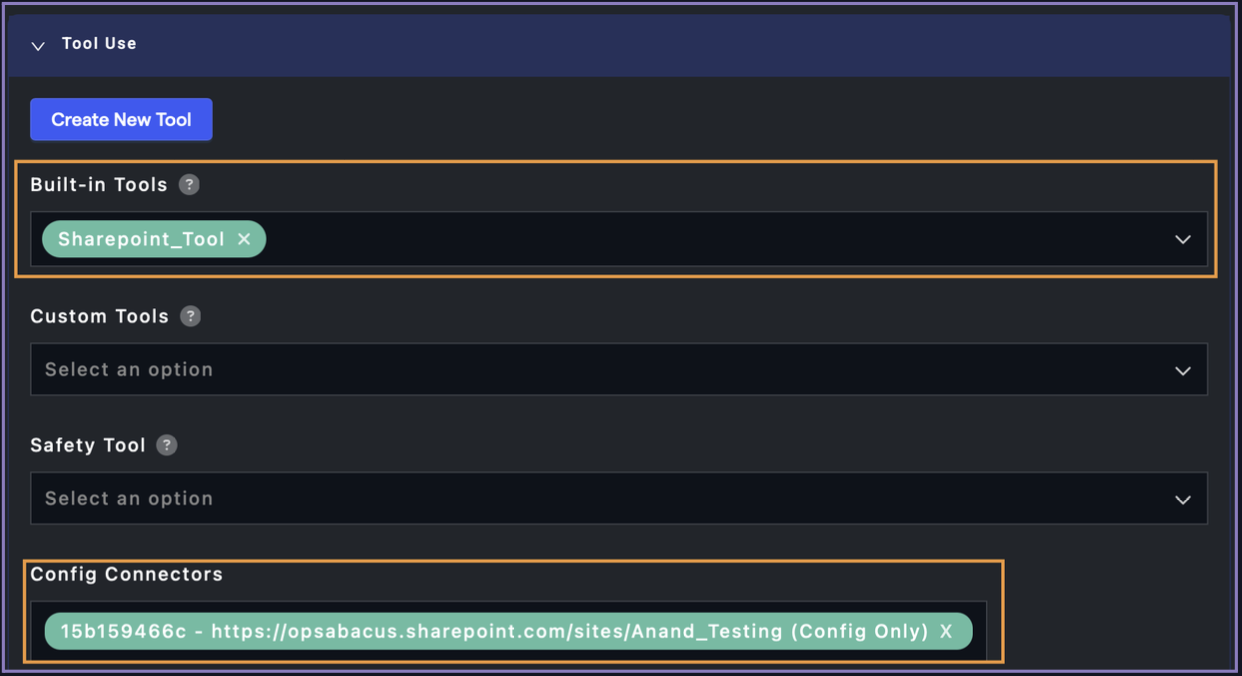 Using the example below, the Sharepoint connector tool has been added in this configuration. In addition a specific Sharepoint connector has been added into the Config Connectors section.