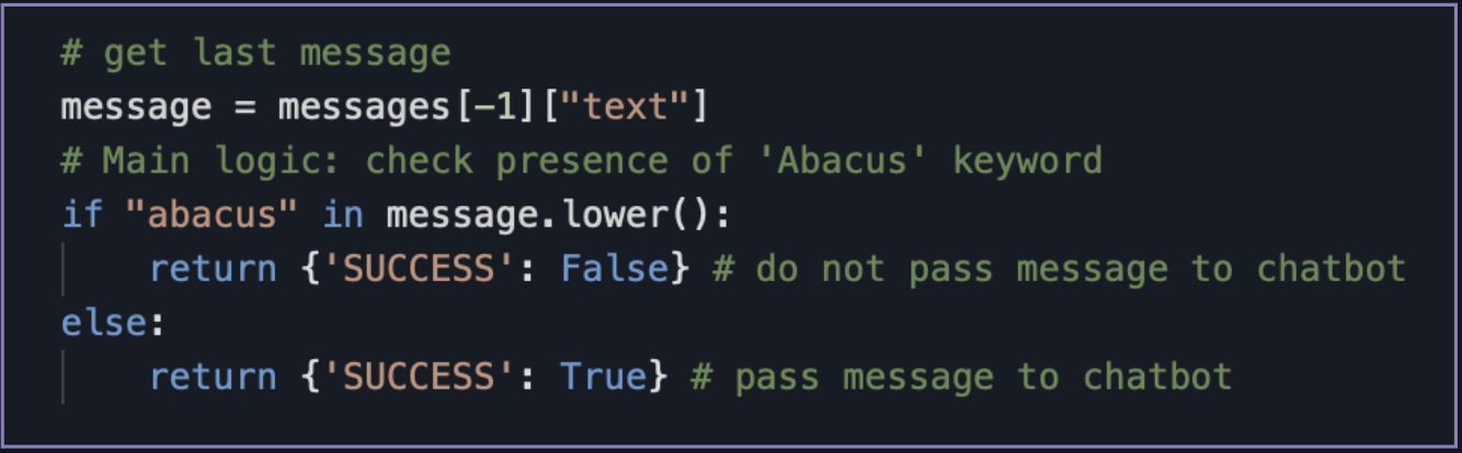 Here is a simple example that looks for a keyword, "abacus", and then blocks the message to the chatbot if it is found.
