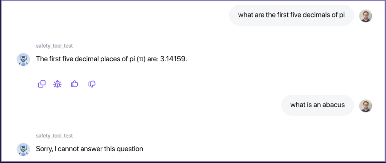 With the safety tool deployed on a custom chatbot, now each time a user asks a question the tool will evaluate if the prompt is "safe" to pass to the underlying chatbot.