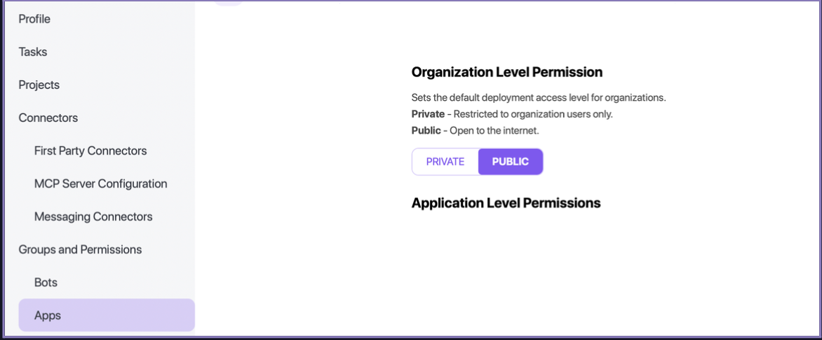 Then on the left-hand menu select Apps. You will see options for both Organizational and Application level permissions. Setting Organizational Level Permissions to private will ensure all apps are deployed behind a sign-in page.