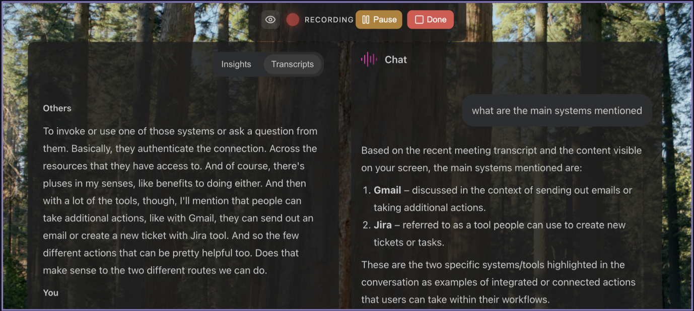 As the Listener is transcribing you can get real-time answers and insights through the chat feature. Full transcripts can also be exported after recording.
