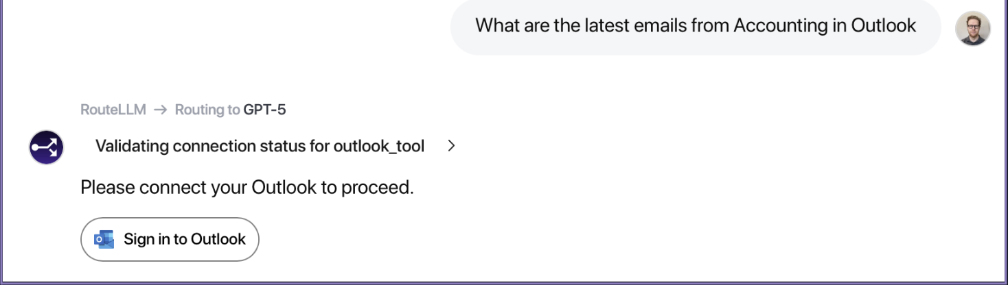 To activate, users can either prompt the system, e.g. "What are the latest emails from Accounting in Outlook" and Abacus will check if the user has authenticated the relevant connector. If not, an OAuth will appear for the user to authenticate, before answering the question: