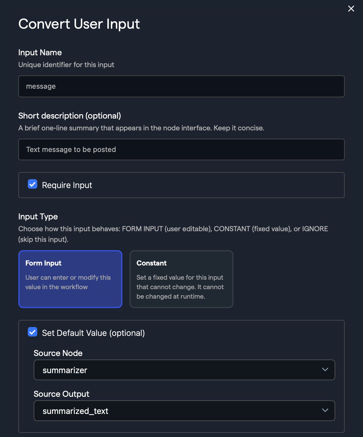 2. Easily convert to node input, using the Convert to Node Input button