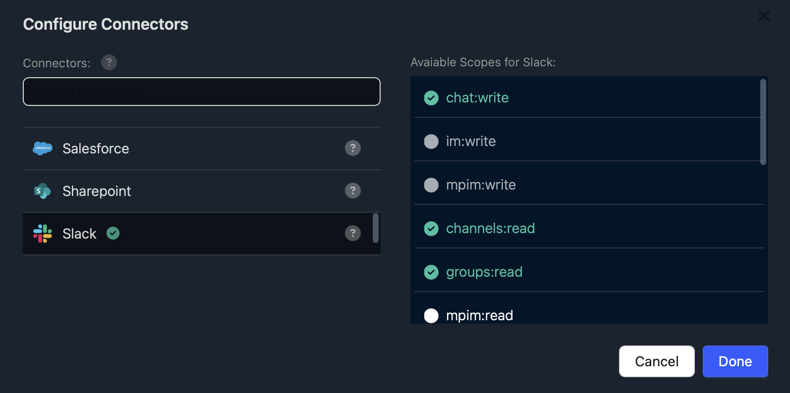 To update any of the specific connector scopes for these tools added to a workflow, click on the configure button. This will allow you to manage the specific access / capabilities for the connectors on a workflow by workflow basis.