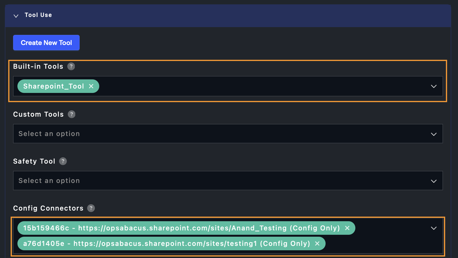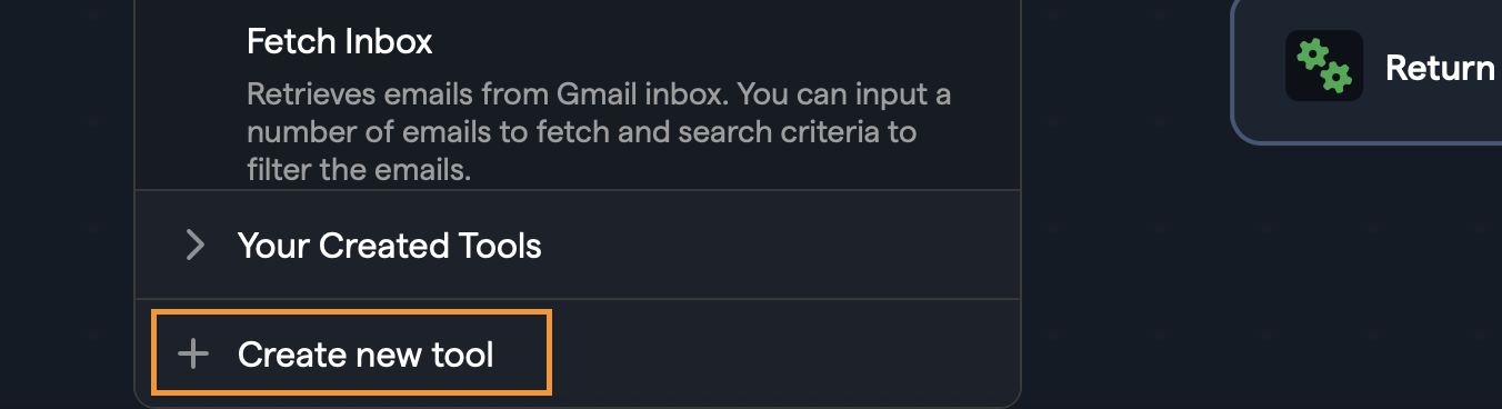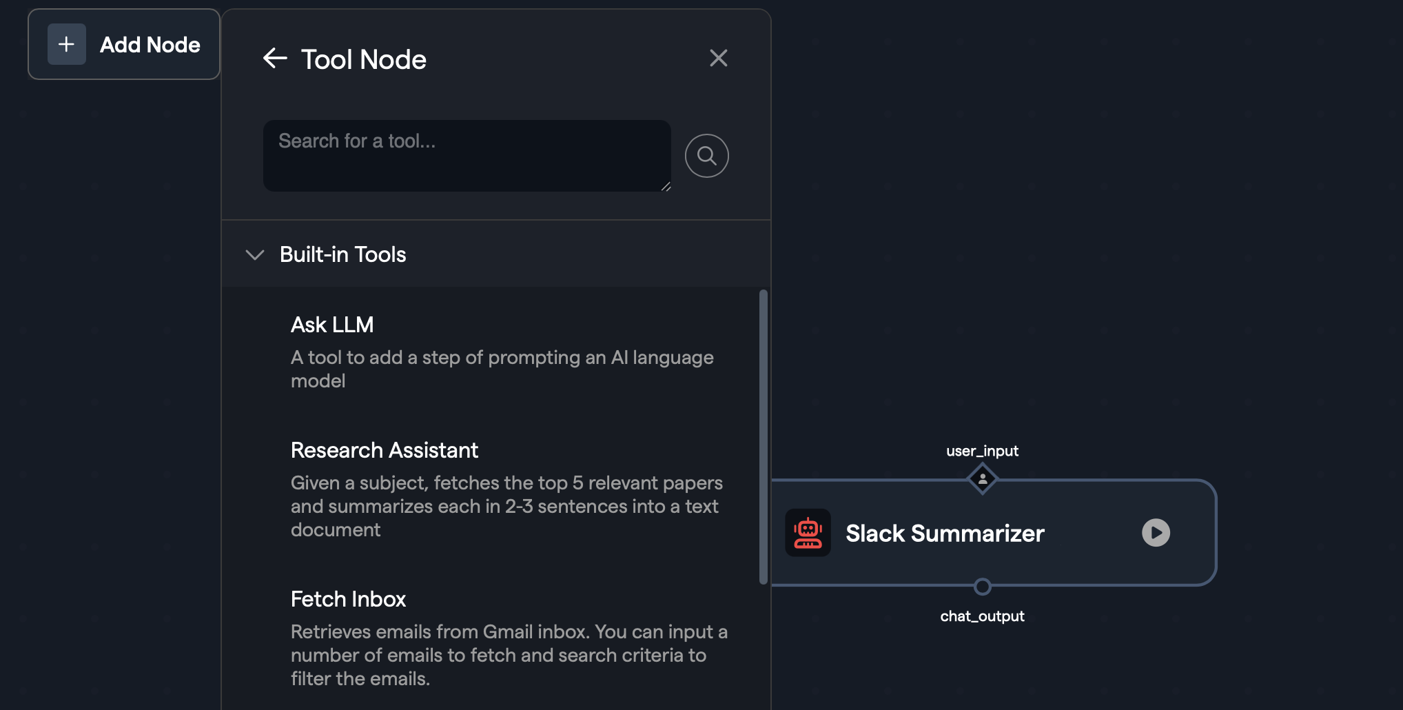 The Tool Node has been improved to make finding relevant tools easier and more intuitive. The UI is split between Built-in Tools that have been build by Abacus and Created Tools that have been built by you or other members of your organization - you can also create new tools with the Create New Tool option.