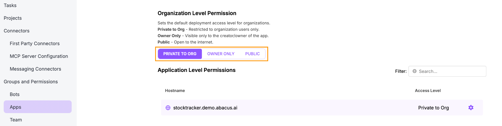 Permission handling for DeepAgent generated apps has been updated to add more controls. At the organization level admins can set the default access permissions for all apps that are created. It can be managed in the Profile >> Groups and Permissions >> Apps menu.