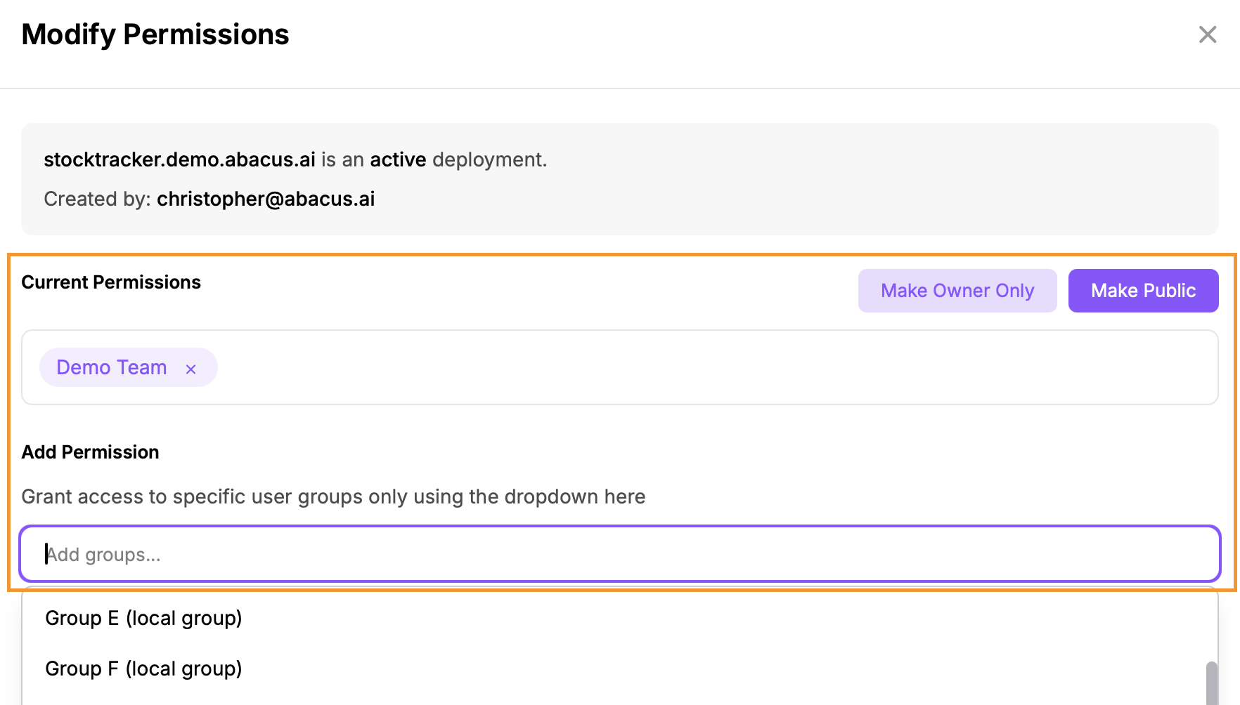 When an app is Private to Org it is also possible to control access based on permission groups that have been created / are available in the platform. To do this use the Add Permissions drop-down in the app’s modify permissions screen: